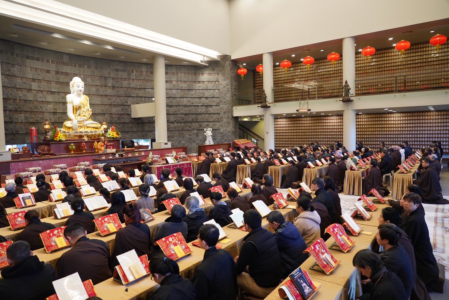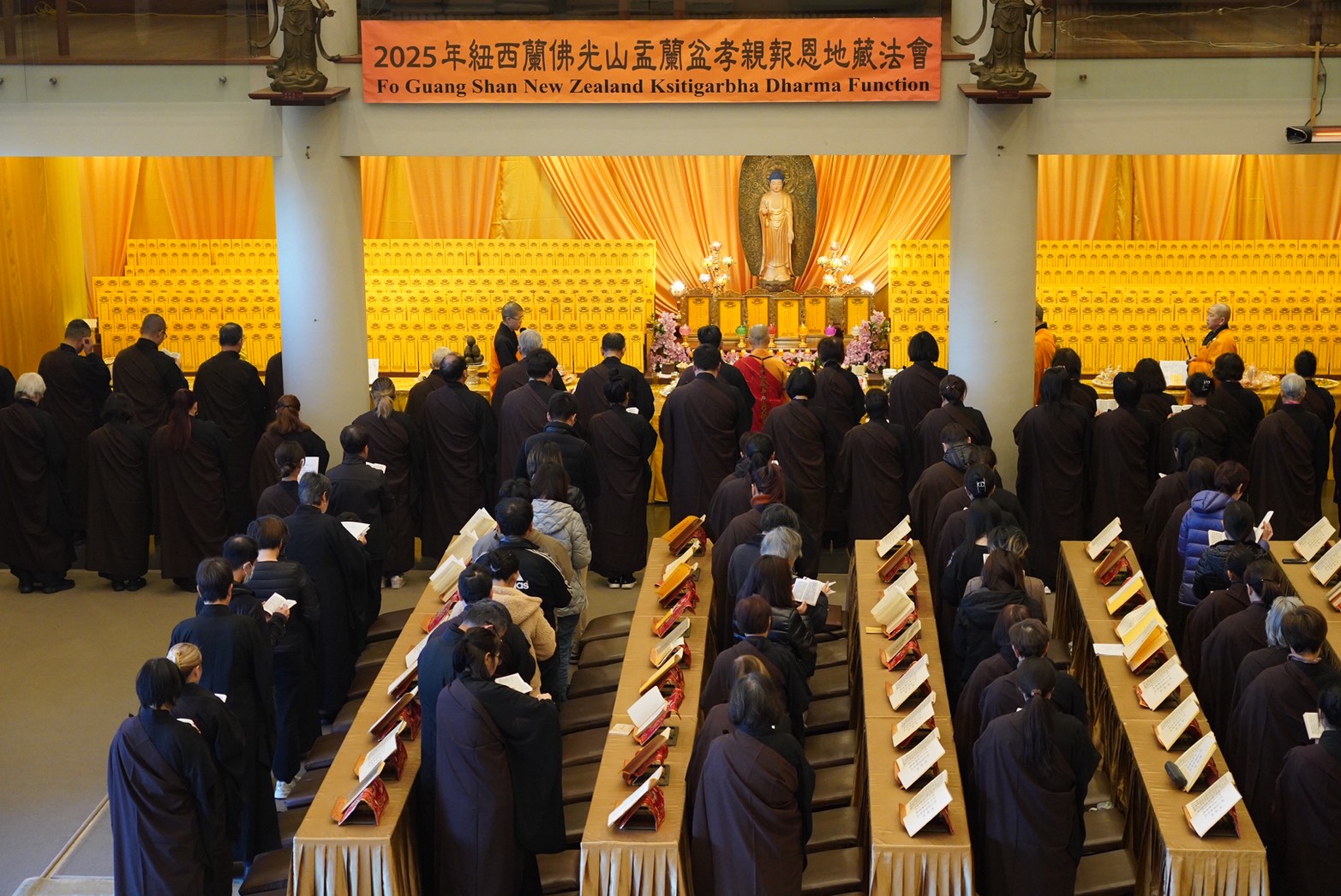 紐西蘭北島佛光山於2025年8月3日啟建一年一度「盂蘭盆孝親報恩地藏法會」, 紐西蘭佛光山住持滿信法師在大雄寶殿主法領眾諷誦《地藏菩薩本願經》,200位大眾虔誠誦經迴向歷代先遠考妣宗親,報答父母的養育之恩,並祈願消災免難闔家平安。