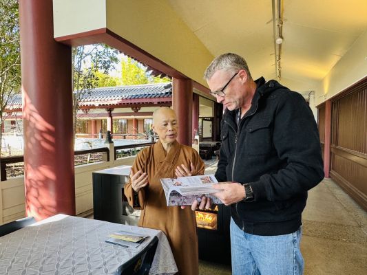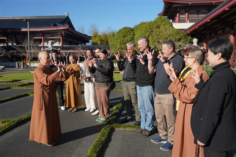 軍官們的學習力很高,其中Richard 軍官提問「佛教為何要吃素?」住持從「尊重生命」、「慈悲心」及「平等觀」的角度為其解惑。軍官反饋此次的參訪讓人深受啟發,尤其身心都獲得滿滿的能量,感受道場是一個淨化大眾心靈的空間,未來將安排更多的同事前來實質體驗佛教所帶來的「安全、寧靜、美學」氛圍。住持代表贈送紐西蘭佛光山弘法報告及2026年曆,也祝福軍官繼續開發自己豐富的潛能。