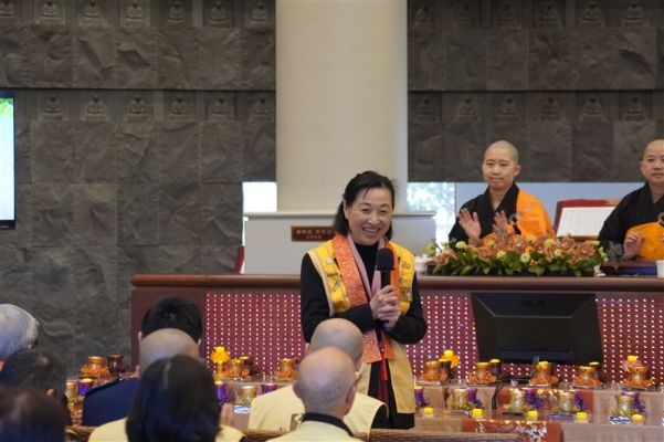 北島協會顧榆齡會長致詞分享,「在佛歡喜日裡,佛光人卯足勁以人間音緣歌曲、短劇、美食來表達對僧寶的敬意,感謝師父們長期不離不棄的教導,讓人間佛教得以在紐西蘭深耕成長。佛光會及信眾因為投入各種活動才有深入佛法的因緣。」顧會長鼓勵佛光人珍惜每一次供僧因緣,發願護持三寶、護持道場。