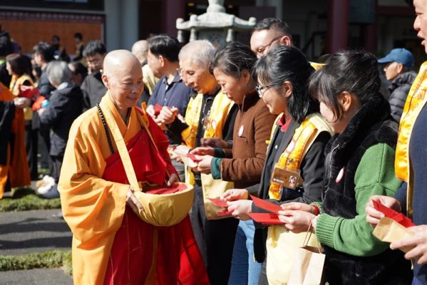 另外,滿信法師指出人間佛教的精神是服務社會大眾,直下承擔無私給予,共同建設人間淨土,並呼籲與會大眾響應慈善捐款。紐西蘭癌症協會(New Zealand Cancer Society)與奧克蘭古董車俱樂部(Auckland Veteran & Vintage Car Club)負責人Jodi Tomlin 與水仙花活動全國統籌負責人Kaaren Smylie特別在供僧法會中向紐西蘭佛光山致意,感謝佛光人慷慨解囊募集善款關懷社會。