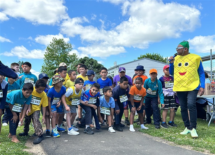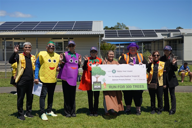 紐西蘭北島佛光山及國際佛光會紐西蘭北島協會於2025年10月31日前往Dawson Primary 小學進行本年度第二場「全球復蔬公益路跑 – 你跑步、我種樹」活動,積極響應綠色公益基金會的號召。當天學校發動全校師生近300人參與,以每跑1公里北島協會將捐贈1顆樹支持紐西蘭全國植樹組織Trees That Count為目標,奮力跑出300棵樹佳績。社教組能謙法師、協會副會長容鎮南等5位佛光人出席現場協助活動,並為學生加油打氣。