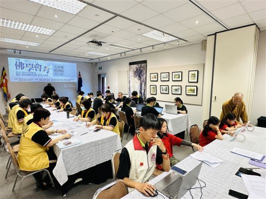 由大洋洲國際佛光會主辦,雪梨協會承辦的「2025大洋洲佛學會考」於11月9日在北島佛光山舉行,以佛光山開山祖師星雲大師著作《人間與實踐》為教材,內容涵蓋人間佛教的思想、佛光會員的實踐精神,以及信仰生活的運用與理解。紐西蘭佛光山住持滿信法師在考試前勉勵各位【佛教的狀元】以平常心參與佛學會考,從認識自己的不足而努力找到正確的方向。人生就像考試一樣,遇到不會的題目,就一題一題去解決,透過用心學習,見聞閱歷多了,智慧也終隨之增長。北島協會顧榆齡會長帶領近 60 位佛光會幹部、會員、佛光青年及兒童佛學班學員的踴躍參與,展現對佛法學習的熱忱。