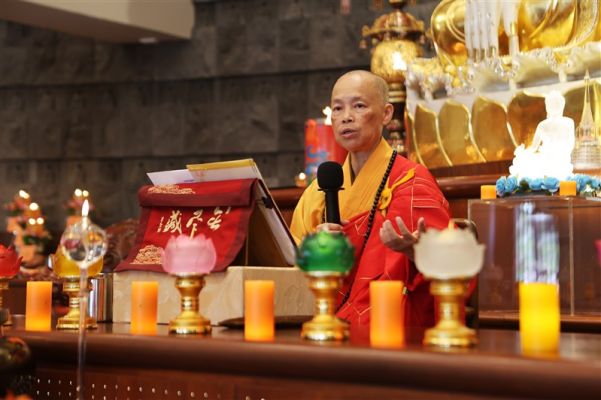 住持滿信法師說明藥師佛十二大願的不可思議並講解極樂淨土莊嚴殊勝的四個特色,一是時空無限,眾生壽命無量,生活自在無礙;二是生活逍遙,衣食住行自然具足,以禪悅為食;三是社會和樂,人與人之間平等和諧,無有爭執;四是融匯一體,彼此不分你我,成就人們理想中的大同世界。