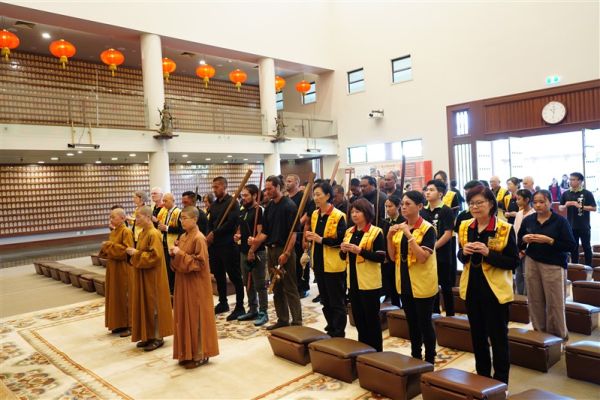 Tamiaho手持象徵領導的戰錛Toki Poutangata引導十四 位毛利武士,於成佛大道及大雄寶殿內揮動Taiaha戰矛,獻上肅穆的戰舞Haka表達致意,祈願佛陀及毛利祖靈以真理、正直與信仰,光照後代子孫, 振奮心中謙卑、懷念與覺察的力量 。北島監寺如廉法師、妙禹法師帶領大眾諷誦藥師咒迴向,祝願武士們歡喜吉祥。