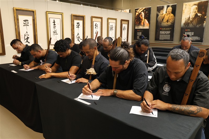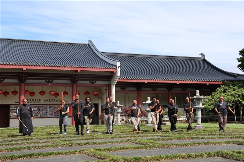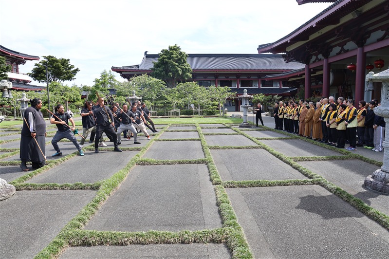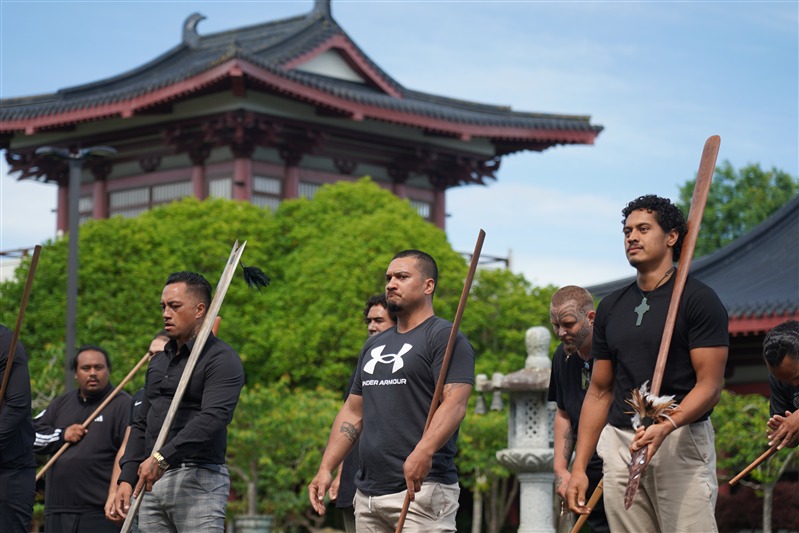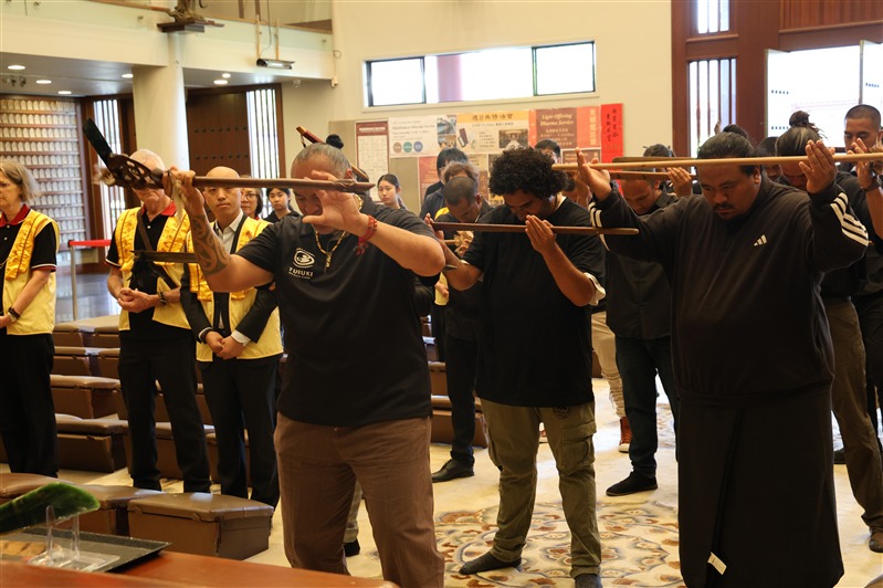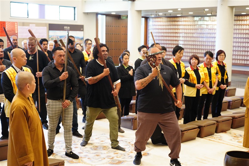Tamiaho手持象徵領導的戰錛Toki Poutangata引導十四 位毛利武士,於成佛大道及大雄寶殿內揮動Taiaha戰矛,獻上肅穆的戰舞Haka表達致意,祈願佛陀及毛利祖靈以真理、正直與信仰,光照後代子孫, 振奮心中謙卑、懷念與覺察的力量 。北島監寺如廉法師、妙禹法師帶領大眾諷誦藥師咒迴向,祝願武士們歡喜吉祥。