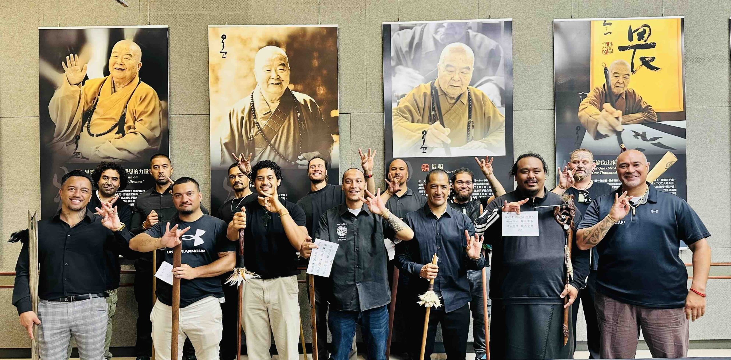 第一武士於 12 月 6 日再度率領 14 位毛利精銳武士參訪道場,以傳統莊嚴的毛利戰舞Haka禮敬常住三寶及佛光山開山祖師星雲大師,展現人間佛教與本土文化的尊重與融合。