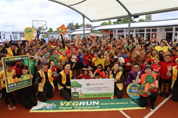 紐西蘭佛光山住持滿信法師帶領團隊聯合校方,透過VEGRUN「你跑步、我種樹」公益路跑傳遞佛光山開山祖師星雲大師「三好四給」的理念,鼓勵大家做好事、說好話、存好心,培養學生慈悲心與責任感。藉由每一步的奔跑與每一棵樹的種植,學校與社區共同守護地球,共同築造綠色未來。