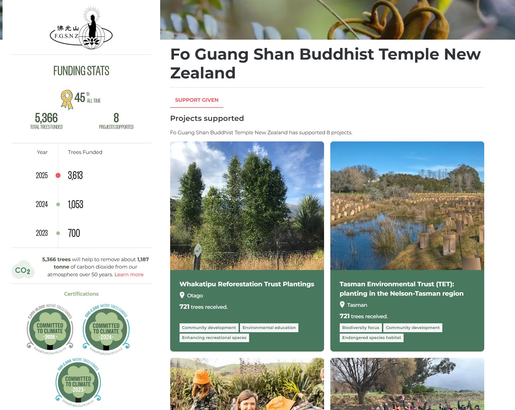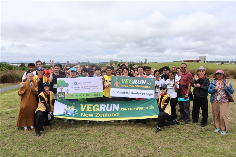 紐西蘭南北島佛光山響應國際佛光會世界總會推動的「全球復蔬公益路跑VEGRUN」活動,自2023年起聯合紐西蘭全國植樹的Trees That Count組織,響應政府提出的「十億棵樹 One Billion Trees Programme」原生森林復育的願景,帶動本土學校共同進行VEGRUN「你跑步、我種樹」的公益路跑活動,啟動全民守護地球生態的行動力。短短三年間,全國共有12所中小學積極參與,紐西蘭佛光山以跑步公里數累積捐贈原生樹木達 5,366棵,捐贈的數量由最初排名第 183 名,躍升至第 45 名,展現道場與校園攜手推動環保行動的實際成果。