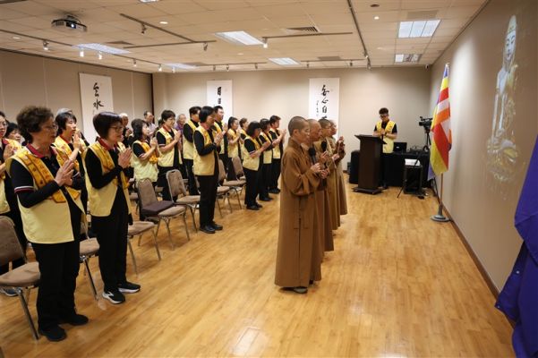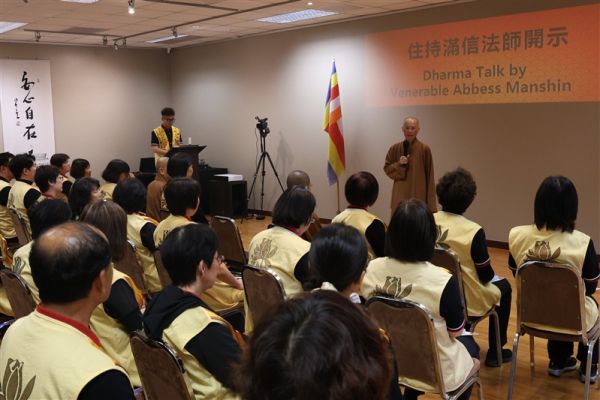 住持滿信法師帶領常住法師與大眾諷誦《藥師灌頂真言》,為社會及大眾祈福。住持開示,生命雖然短暫但可以非常豐富有價值,鼓勵大眾重視良好習慣的養成,精進聽聞善法,透過用心承擔與實踐,開發自身潛力,把智慧和經驗分享給他人。住持表示北島協會督導長余林濤因發心讓佛法課程能利益更多人,運用其專業技術開發人工智慧語音即時中英文翻譯程式,翻譯精準度高達95%,獲得國際佛光會世界總會的肯定與實際應用,為佛教做出卓越貢獻,勉勵大家以督導長為榜樣,急佛教所急,想佛教所想,集體創作為教獻力,為佛教留下因緣。
