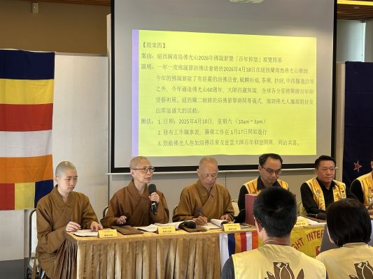 會中提出九項提案討論,提案一、2026年澳洲南天寺「迎請舍利奉安典禮」。 提案二、2026年人間佛教生活講座「法華經的般若智慧與善巧方便」。提案三、紐西蘭北島佛光山2026年佛誕節暨舍利安奉典禮。提案四、紐西蘭南島佛光山2026年佛誕節暨「傳燈六十 百年仰望」展覽開幕。提案五、國際佛光會2026大洋洲聯誼會。提案六、2026南島佛光山咖啡巧克力嘉年華會。提案七、人間佛教研究院妙凡院長及程恭讓教授佛學講座&《紐西蘭人間佛教發展史》新書發表會。提案八、2027年國際佛光青年會議「IBYC」由紐西蘭北島佛光山主辦。提案九、佛光山2026年禪淨共修獻燈祈福法會報名參與。跟進提案包括:一、2025年Vegrun全球路跑共跑出2205公里,捐出紐幣22050元,共種下2205棵樹。二、2026年歲末圍爐晚宴。三、《星雲大師人間佛教傳燈錄》讀書分享會將於2026年母親節舉辦。
