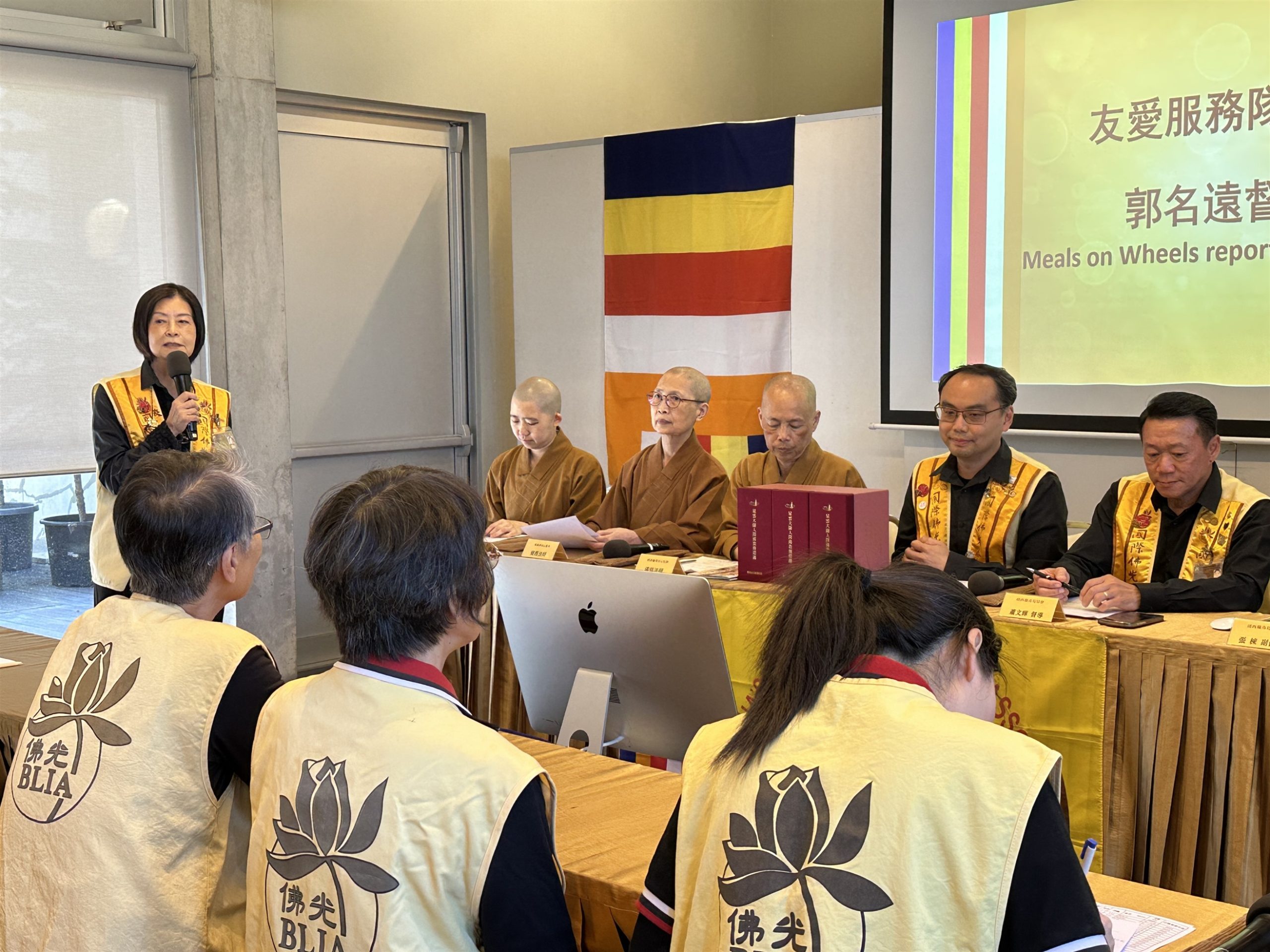 南島協會會長劉盎齊致詞感謝大眾這一年的發心護持,特別是常住一路來的指導及協會幹部的配合,共同呈現歡喜又豐碩的一年,期待大眾繼續努力,展望全新的未來。第一分會會長蘇妍、第二分會會長何飛、第三分會會長姜佩儀分別會報各分會所舉辦的活動,如佛誕節、咖啡巧克力嘉年華、人間佛教傳燈讀書會、茶禪、生活講座、Vege Run、366送書、臘八粥、等活動,展示活動成果與努力。友愛服務隊隊長郭名遠分會督導分享佛光人投入紅十字送便當服務已近三十年,風雨無阻地為當地長者服務結緣,令人鼓舞。