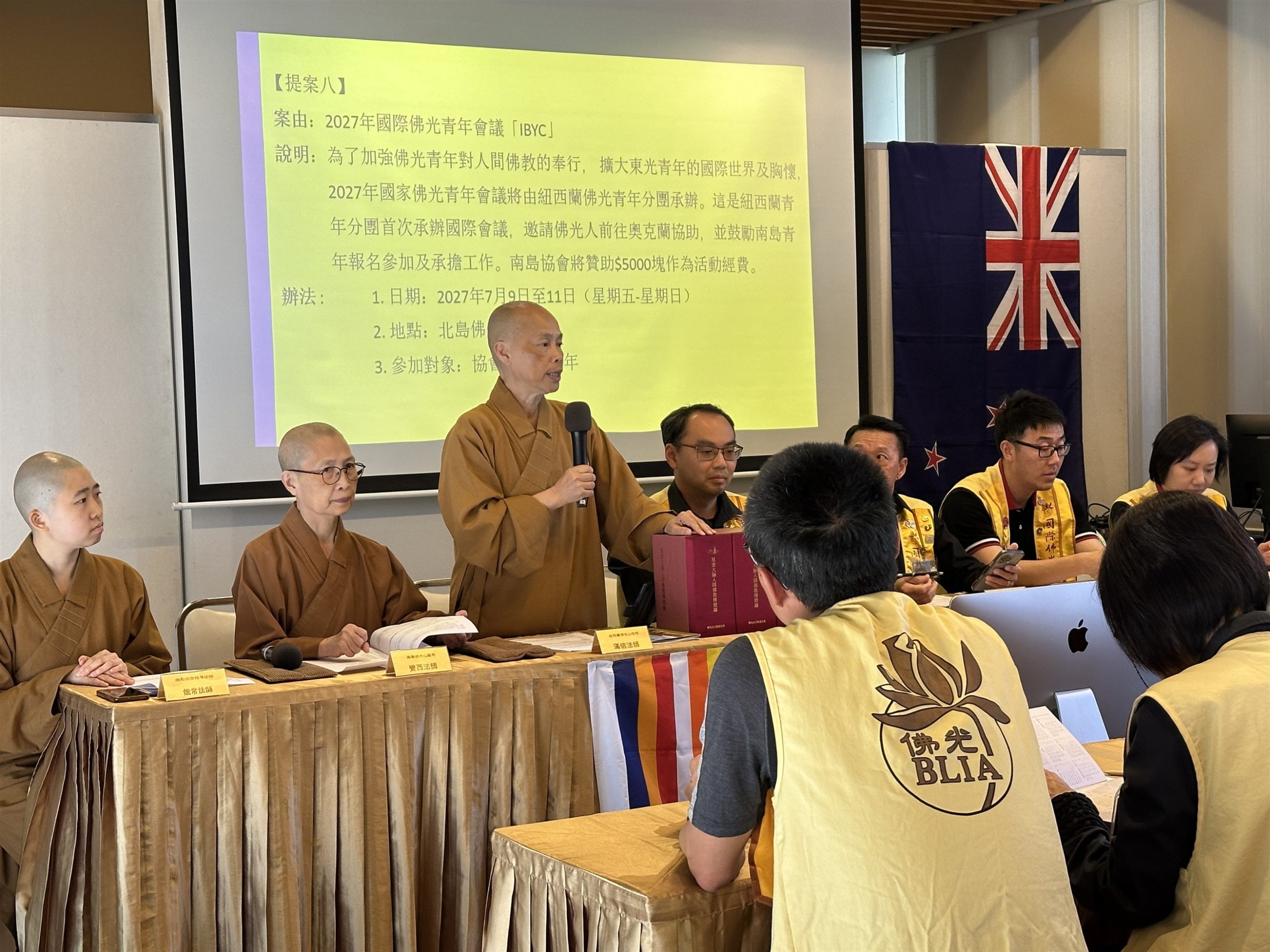 會中提出九項提案討論,提案一、2026年澳洲南天寺「迎請舍利奉安典禮」。 提案二、2026年人間佛教生活講座「法華經的般若智慧與善巧方便」。提案三、紐西蘭北島佛光山2026年佛誕節暨舍利安奉典禮。提案四、紐西蘭南島佛光山2026年佛誕節暨「傳燈六十 百年仰望」展覽開幕。提案五、國際佛光會2026大洋洲聯誼會。提案六、2026南島佛光山咖啡巧克力嘉年華會。提案七、人間佛教研究院妙凡院長及程恭讓教授佛學講座&《紐西蘭人間佛教發展史》新書發表會。提案八、2027年國際佛光青年會議「IBYC」由紐西蘭北島佛光山主辦。提案九、佛光山2026年禪淨共修獻燈祈福法會報名參與。跟進提案包括:一、2025年Vegrun全球路跑共跑出2205公里,捐出紐幣22050元,共種下2205棵樹。二、2026年歲末圍爐晚宴。三、《星雲大師人間佛教傳燈錄》讀書分享會將於2026年母親節舉辦。