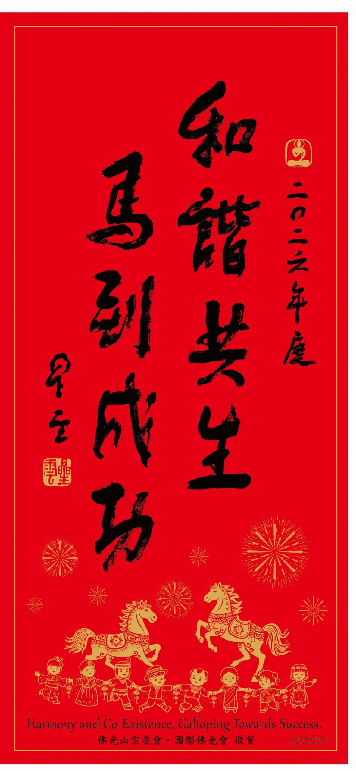 「萬象更新開泰運,百業同心展宏圖」,時序來到丙午馬年,今年適逢佛光山邁入開山60周年,同時也是佛光山開山祖師星雲大師百歲誕辰紀念,心保及佛光山全球僧眾,謹以大師的新春祝福語「和諧共生,馬到成功」,祝願大家「與人為善,你好我好大家好,共生共榮,共赴美好未來」。