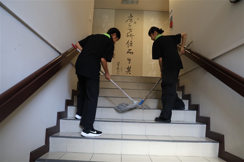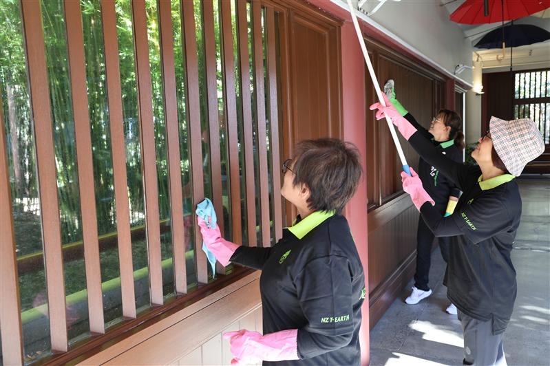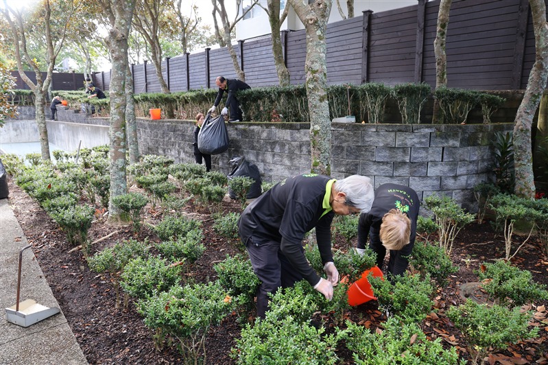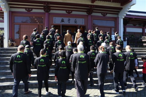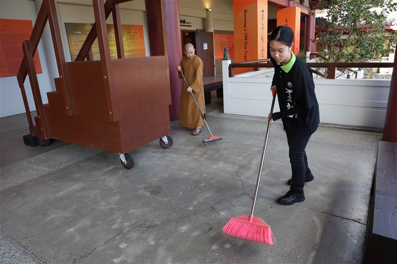 紐西蘭佛光山住持滿信法師領眾諷誦《心經》,為世界環境及社會大眾祈福。隨後監寺如廉法師帶領大眾分成四組到道場的個角落進行出坡,包括清潔各殿堂戶外窗棱、清掃停車場和園林落葉、整理觀音殿前圓環的爬藤及清潔大寮等。大眾發揮集體創作的精神,分工合作,迅速而有效率地完成各項任務。大寮的義工亦準備豐富可口的素食午餐,為大家及時補給充電。