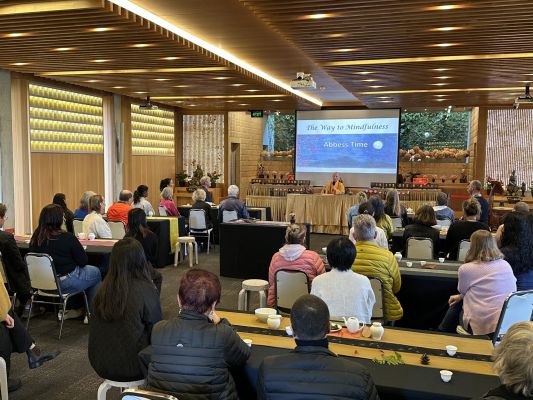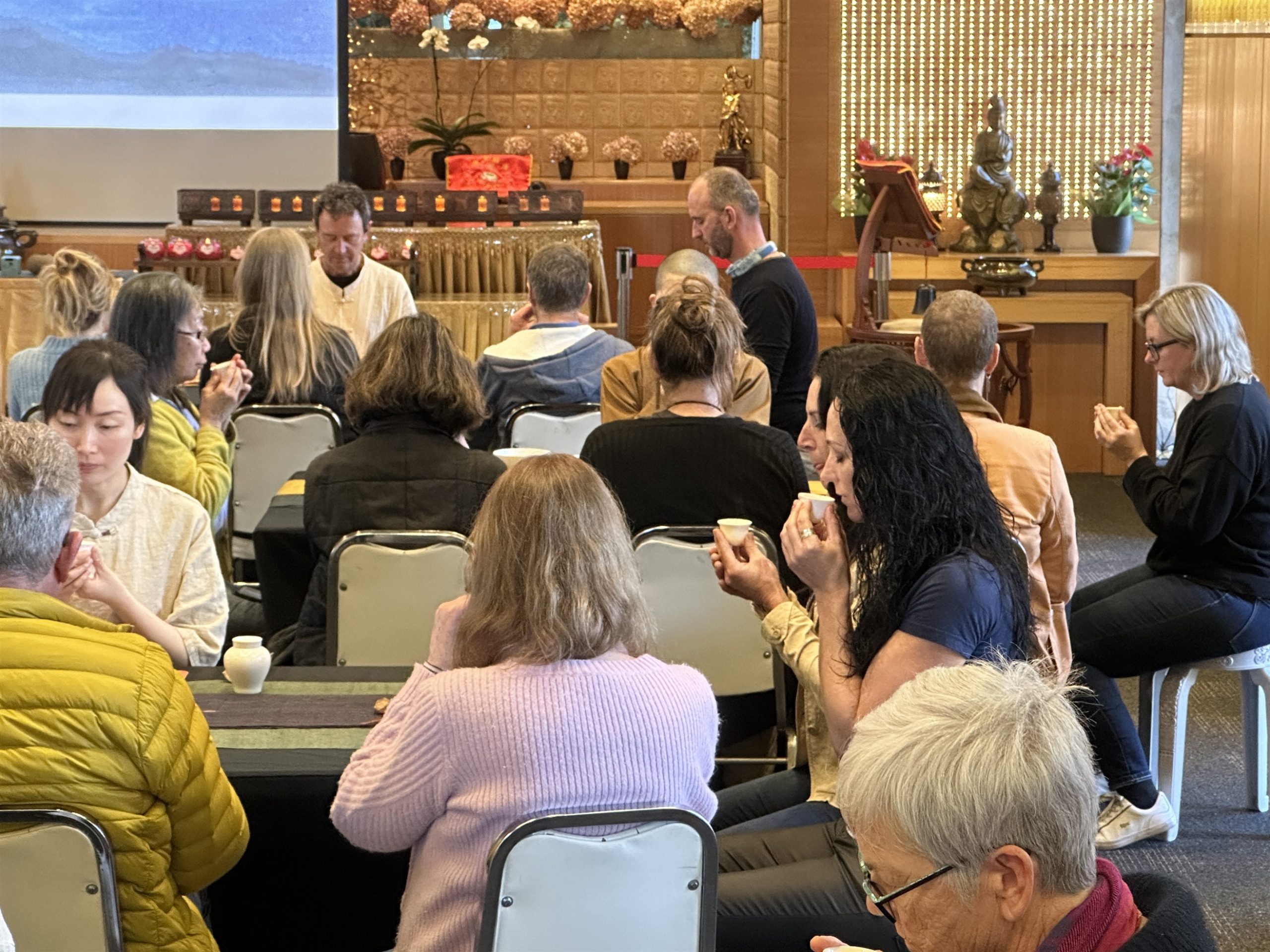 紐西蘭南島佛光山於2025年7月20日舉辦冬季「拈花微笑禪心茶話會」,近50位當地英文人士參與。主辦單位在如來殿設置茶席八張,茶禪行者由英文書院學員及協會幹部擔任、住持滿信法師說法解禪機。大眾在靜謐的空間沉澱身心,回歸自性。