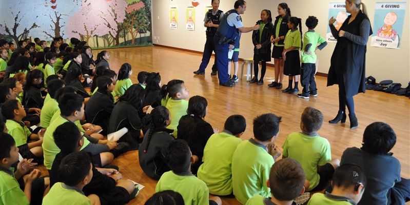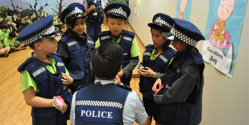 紐西蘭警署部馬努考區的兩位警員Piho及Martin與學生們互動,通過有獎問答及戲劇表演等活動,加深學生「三好四給」的理念及運用在生活中。學生好奇向警察提出「當警察是什麼感受?會危險嗎」、「你可以開直升機嗎」、「馬努考有多少個警察局」、「為什不參軍」。「當警察多久了」等趣味問題,兩位警員一一機智回應。