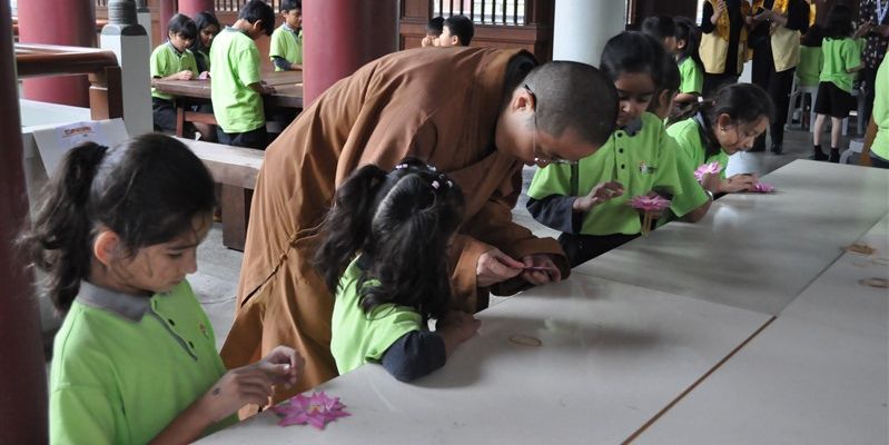 活動圓滿之際,常住贈送星雲大師法語書籤於學生,提醒自己要時時行三好。學生歡喜信受,表示母親節即將來臨,要將自己親手製做的折紙蓮花送給媽媽作為母親節的禮物。