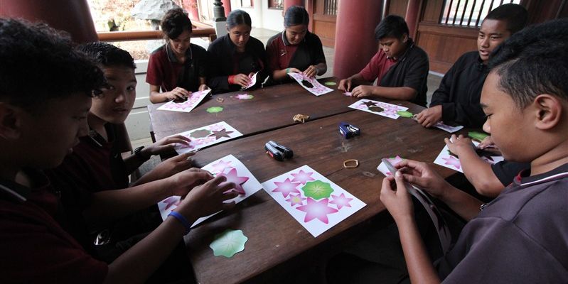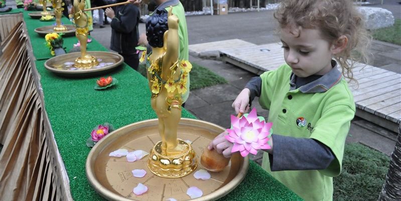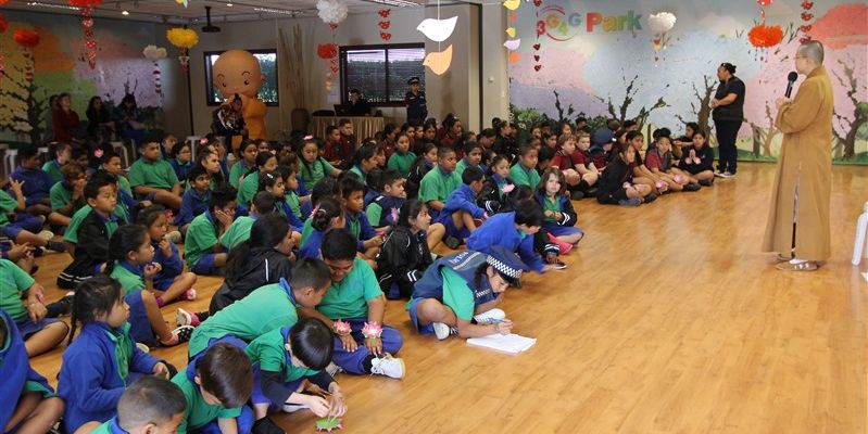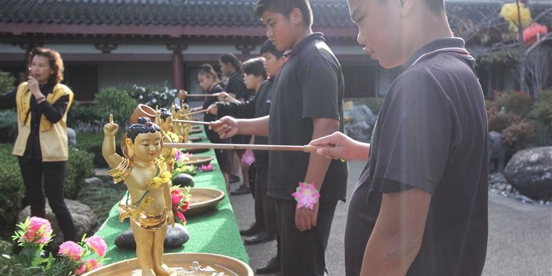 北島協會Sally副會長首先為學生說明活動內容,指導學生合掌,以中文說「吉祥」問候語,學生即分為5組分別進行折紙蓮花、參觀佛誕特展、歡喜浴佛、敲鐘許願、三好四給貼紙、禪坐靜心及點心聚餐等活動, 道場四周洋溢著學習 「三好四給」的誦讀聲及活潑的歡笑聲。在佛誕特展中,學生仔細聆聽導覽義工介紹佛陀的故事、獻花、大聲一起朗讀星雲大師的「我願」,並在許願卡上寫下自己的心願。在成佛大道上,導覽義工為學生介紹大鐘鼓的功用及寺院的軟硬建設,並帶領學生相繼敲響許願鐘。在藍毗尼園中,佛光人生動講述悉達多太子的故事,并運用三好四給教授學生歡喜浴佛。教學團隊通過各式的活動為學生講解如何於生活中融入三好四給的理念,播撒善美的種子。