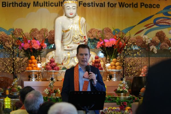 國會議員Dr Hamish Campbell表示雖然紐西蘭遠離戰爭與衝突,社會和人們的身心健康仍有共通之處。面對環境挑戰,佛教所提倡的慈悲與相互依存的理念,拉近彼此的連結,讓不同背景與信仰的人們互相理解,以建立更和諧的社會。他感謝佛光山在社區舉辦這場充滿意義的活動,也感謝各宗教代表蒞臨參與,共同為和平願景祈願。