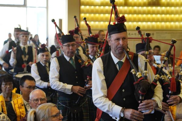 祈福法會以蘇格蘭風笛掀開序幕,紐西蘭佛光山住持滿信法師引領大眾祈願祝禱,恭讀佛光山開山祖師星雲大師〈為世界和平祈願文〉,場面莊嚴隆重。