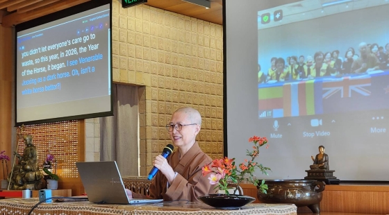 滿信法師致詞表示2026年是佛光山開山六十周年也是開山祖師星雲大師百年誕辰,本山及海內外各道場以「傳燈六十 百年仰望」來祝賀。大眾應秉承大師教誨落實「三好」「四給」及「五和」精神為社會注入正面力量。住持勉勵大眾在生活中善護心念讓好種子生根發芽,並以大師法語「和諧共生 馬到成功」,祝福大眾像駿馬一樣充滿智慧與活力。