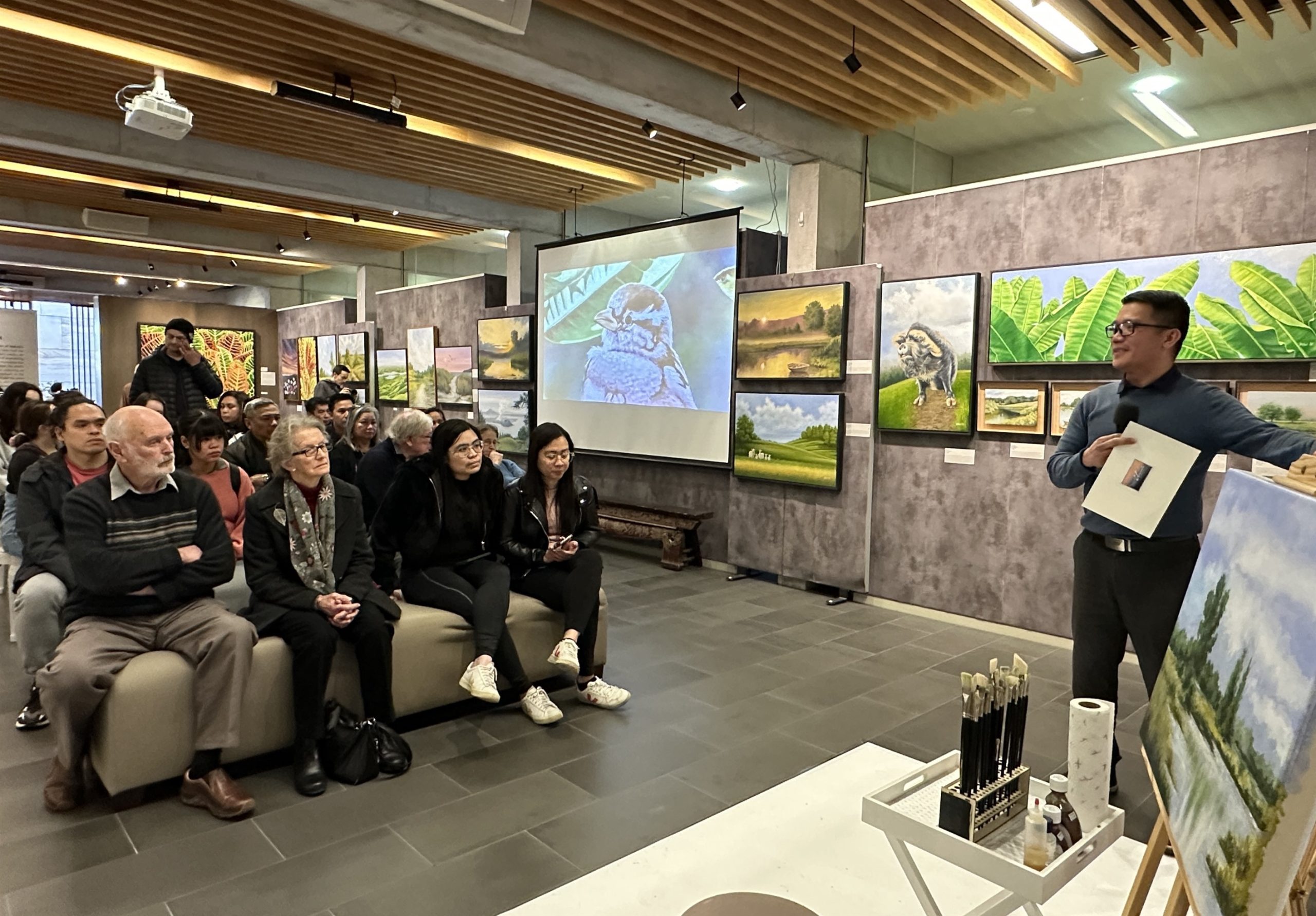 佛光緣美術館紐西蘭二館配合正展出的「Harmony & Hue油畫展」,於2025年7月26日進行一場油畫藝術教育推廣。藝術家Gregorio Gary Umali近距離與學員們現場示範畫作構圖技巧。參與者包括銅絲藝術家Leonore Ashby及佛光緣之友近30人。