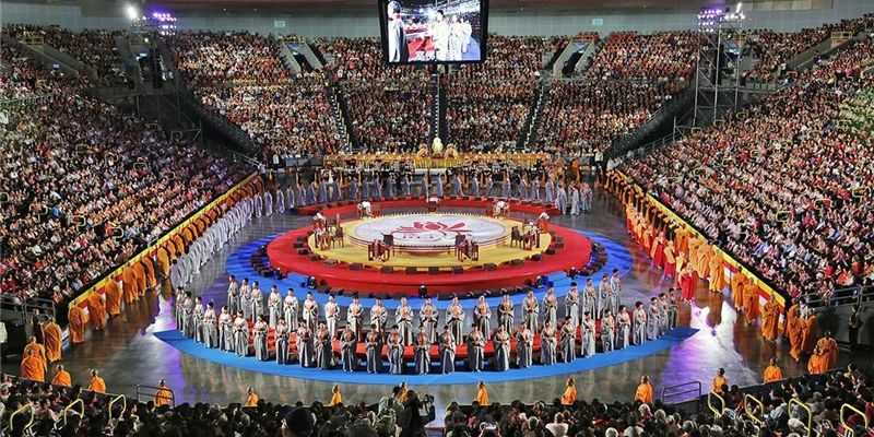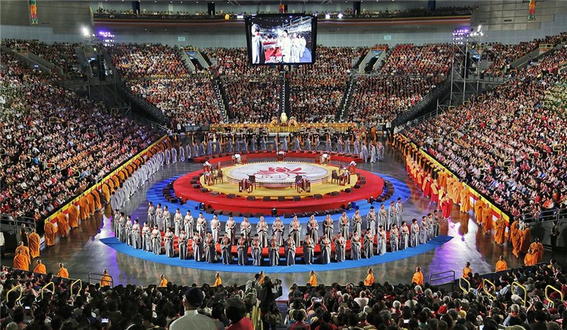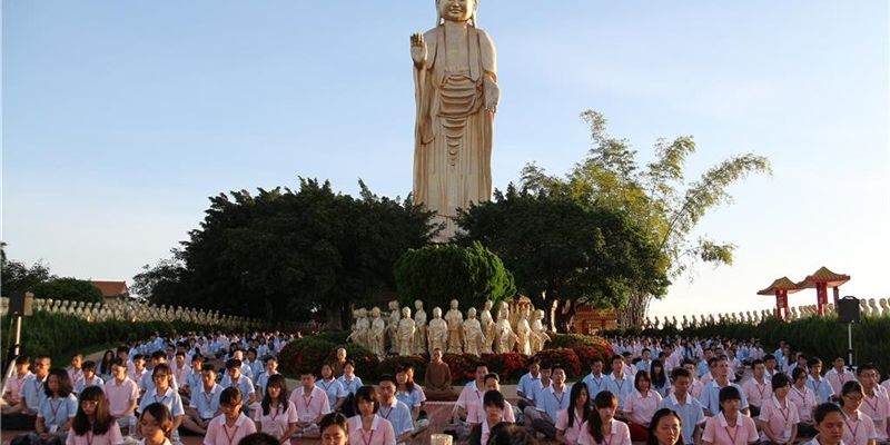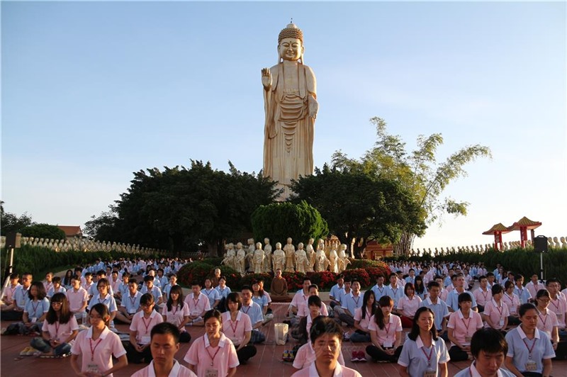 現在,佛光山在世界上設立三百多個道場,也像基督教星期日禮拜一樣,每個道場周六舉行共修。全球佛光人同一時間,同步念佛,平均每一個道場以三百人至五百人計,就有萬人同時念佛共修,向自己的內心探討自我的世界,不向外面的世界追求,自己也增加了對佛教的信心。