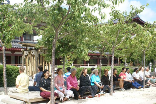 英文禪修會~生命的價值在自己手中 02 月 21, 2009 紐西蘭北島佛光山英文共修會於2月21日上午十點,由妙宇法師於領太極運動後進行系列「禪修課程」,首先以動中禪~跑香,環繞寺院四週園林,體會大自然清新氣息,調解身心及淨化心靈,接著以「觀雲」作為靜中禪之所緣境,學習體悟「緣生緣滅、去除執著」之義理。妙宇法師以「生命在我手中、誰最偉大」之典故講解佛法因緣觀,並從耐心、決心及真誠之心對待他人以外,更要控制情緒,讓彼此發揮互助友愛精神,增添生活色彩,20餘位學員與會。