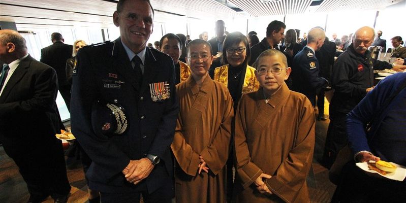 紐西蘭皇家警察馬努考區7月3日上午,在馬努考理工學院大禮堂舉行「2015年馬努考區警察傑出頒獎典禮District Awards Ceremony」,馬努考地區警察總監Superintendent John Tim特別邀請紐西蘭佛光山出席觀禮。出席者有紐西蘭副警署長Grant Nicholls、紐西蘭代警署長助理Richard Chambers、馬努考地區警察總監Superintendent John Tim、Hunua區國會議員Andrew Bayly、警員,受獎家屬與貴賓等250餘人共襄盛會,紐西蘭北島佛光山監院覺豪法師、妙禹法師、分會督導梁崇儀,佛光青年等5人共同前往出席 。此頒獎典禮項目包涵長期服務獎章、見義勇為感謝狀及傑出警員金幣,其中長期服務獎有服務14年、21年、35年以上,約廿位警官獲此獎勵。