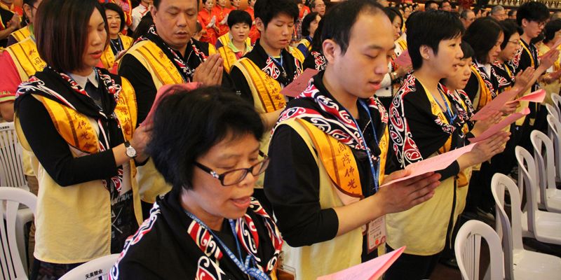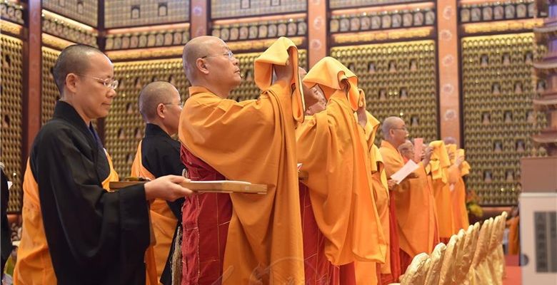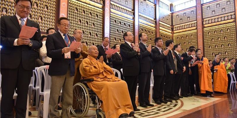 法鼓震天威,在鐘鼓齊鳴中,由學誠大和尚等十一大師帶領近百位佛光山法師魚貫步入壇場,接著由北京、上海、南京等地信徒及青年,身穿中華民族傳統服飾與現代禮服,獻上茶、花、燈、寶等供養諸佛菩薩。