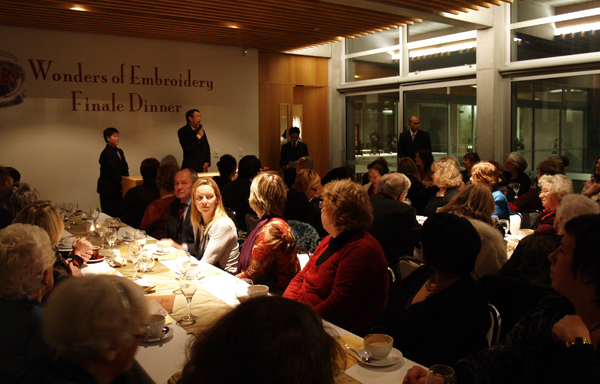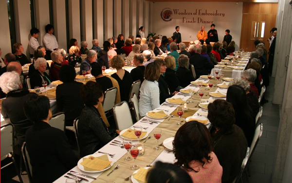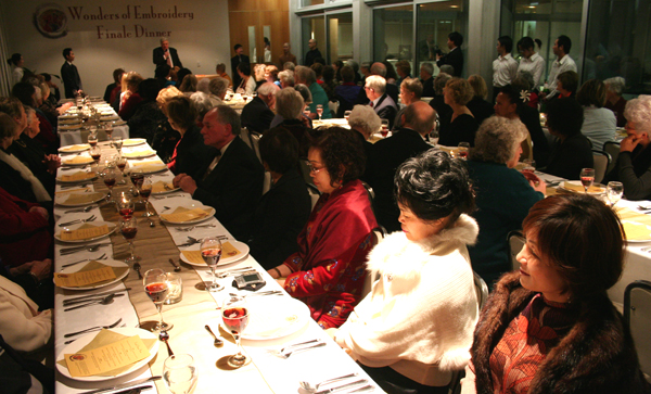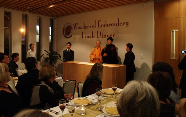 晚宴以西餐的模式進行,在古典音樂和幽雅的氣氛下,貴賓們享用著南島佛光山典座師姐用心製作的精緻美食。用餐當中,主持人為現場貴賓準備猜謎遊戲,答對者獲得姚紅英小姐本人送出的小繡物。晚餐結束前,南島協會鄭海文會長致詞感謝當晚參加宴會的貴賓並希望他們都常來道場。最後姚紅英小姐贈送每位出席貴賓一份結緣品。晚宴後姚紅英小姐示範雙面繡的技巧,接著姚紅英小姐與館長滿信法師為刺繡作品—王昭君閉幕,大眾在不捨的情緒中,搶看王昭君最後一眼。