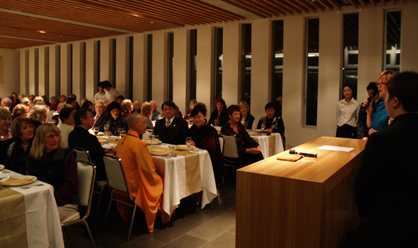 7月26日晚間紐西蘭二館特別為姚紅英小姐舉辦了一場別開生面的閉幕晚宴,地點設在南島佛光山。100位紐西蘭的大眾盛裝出席晚宴,紐西蘭二館館長滿信法師致詞感謝姚紅英本人親自到來紐西蘭現場跟大家分享她的作品,她的出現讓平靜的基督城沸騰熱鬧起來。館長滿信法師指出,南島佛光山是佛光山開山宗長星雲大師送給基督城的一份禮物,這優美高品質的建築物,讓人帶來無限的創作動力,所以無論大家是什麼背景都歡迎再次回來和參觀這個道場及美術館。