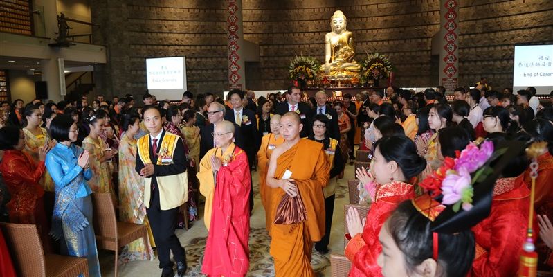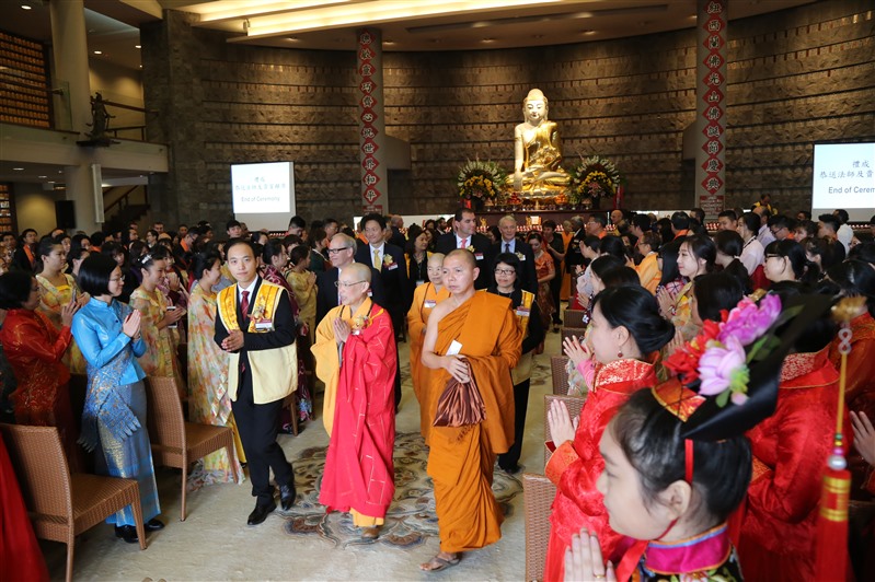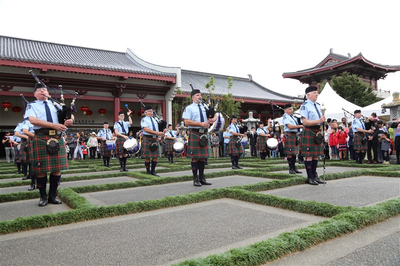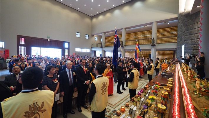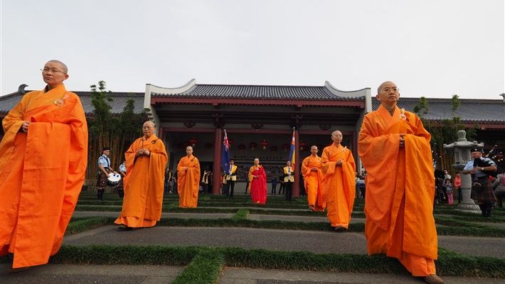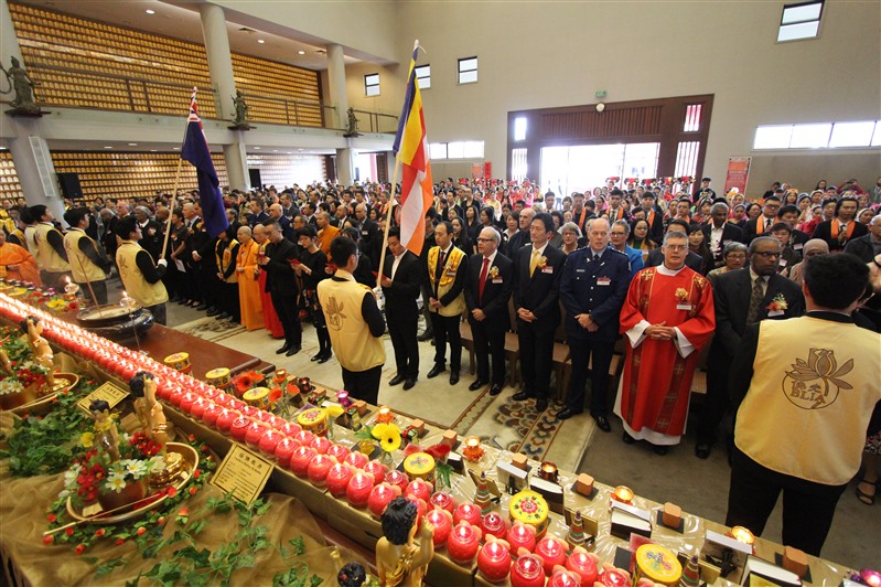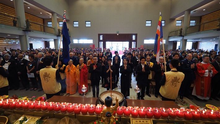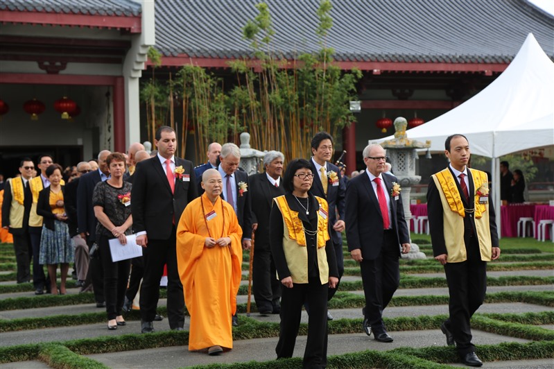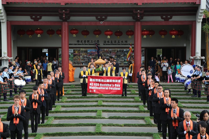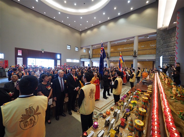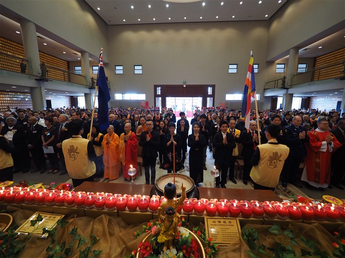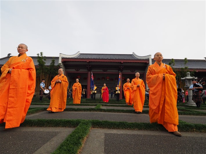 大會主席國際佛光會紐西蘭北島協會余林濤會長、佛光山教育院院長兼菲律賓總住持永光法師、蔡素芬督導長引領當地政界、警界、僑界、商界等與會貴賓入席,30位佛光青年帶領全場大眾獻唱紐西蘭國歌及三寶頌。
