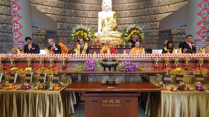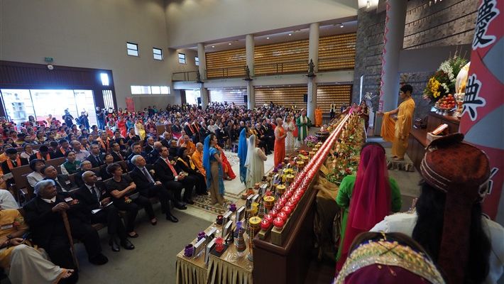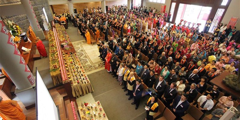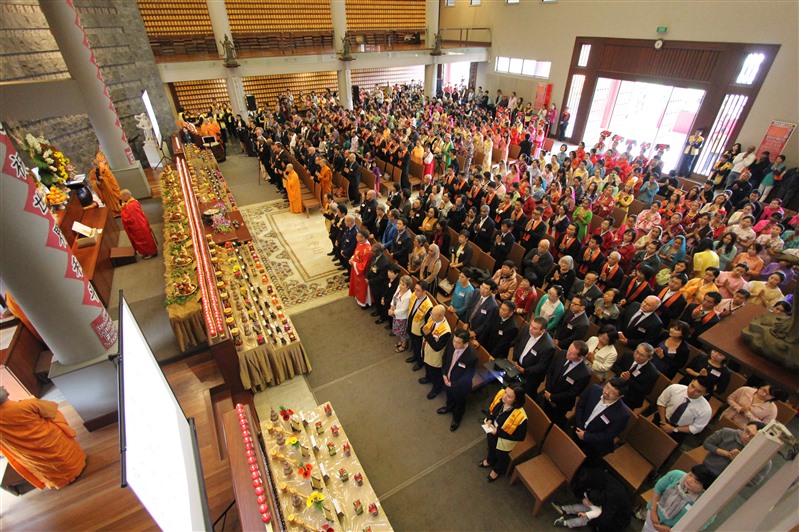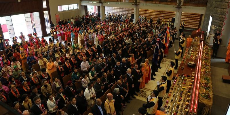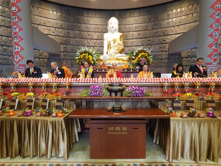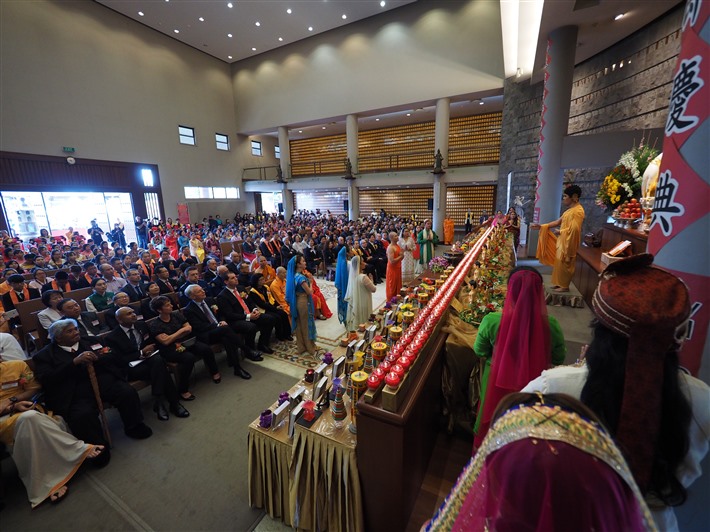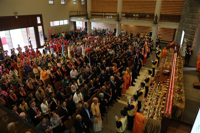大雄寶殿內近300位獻供者身穿色彩斑斕的各國服飾以豐富的供品敬獻佛陀。整齊的金剛迎請隊伍、佛光青年舞獅表演及奧克蘭警署部風笛樂隊為悉達多太子金轎開道,使成佛大道呈現莊嚴、殊勝的熱鬧場面。