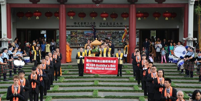 鐘鼓齊鳴啟動「2016年紐西蘭北島佛光山佛誕節」慶典儀式,5000多位大眾於5月8日湧入北島道場浴佛慶佛誕。道場從素食園遊會、佛誕特展、佛光寶寶祝福禮、多元文化表演、小太子裝扮秀到文教攤位等各個豐富的活動,處處可見攜家帶眷歡喜融合的景象,藉浴佛洗滌身心,收穫一份祝福。