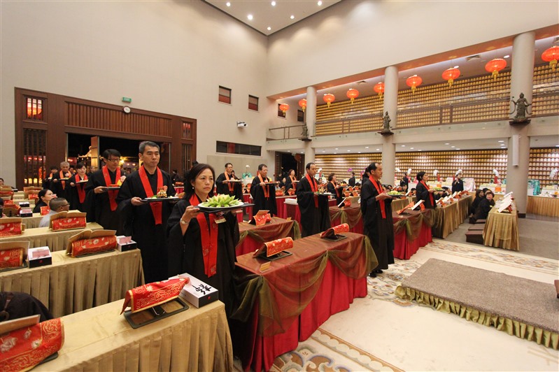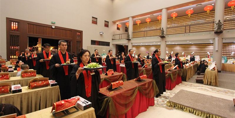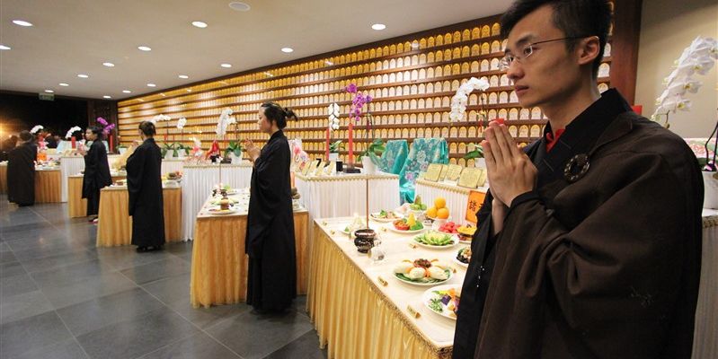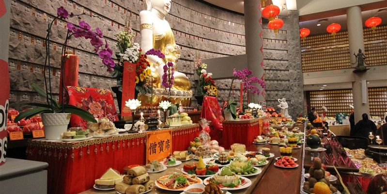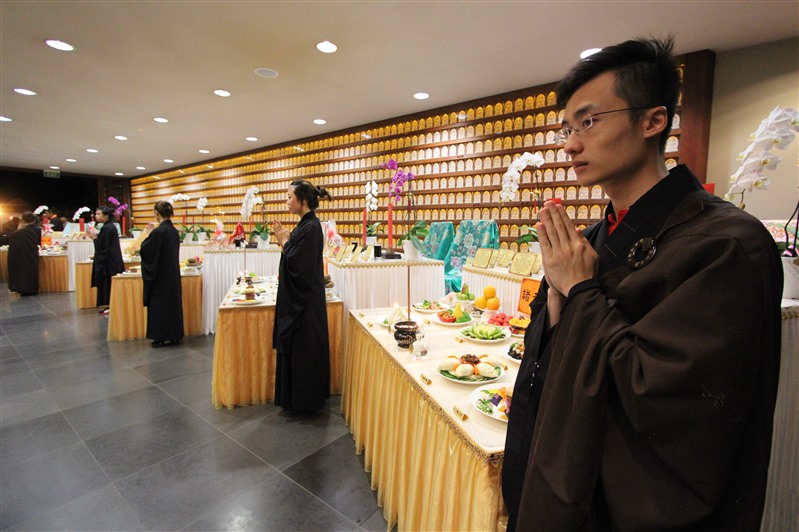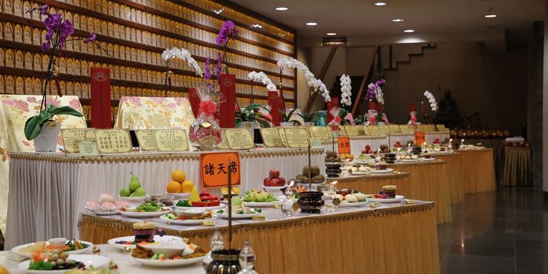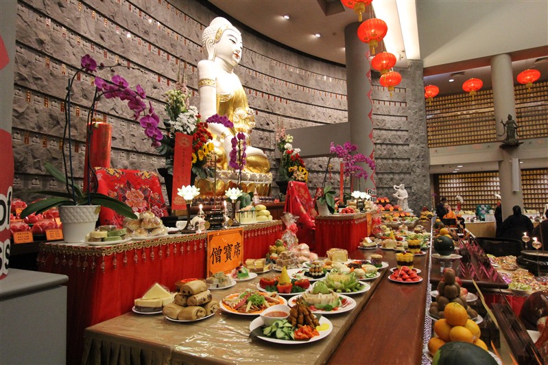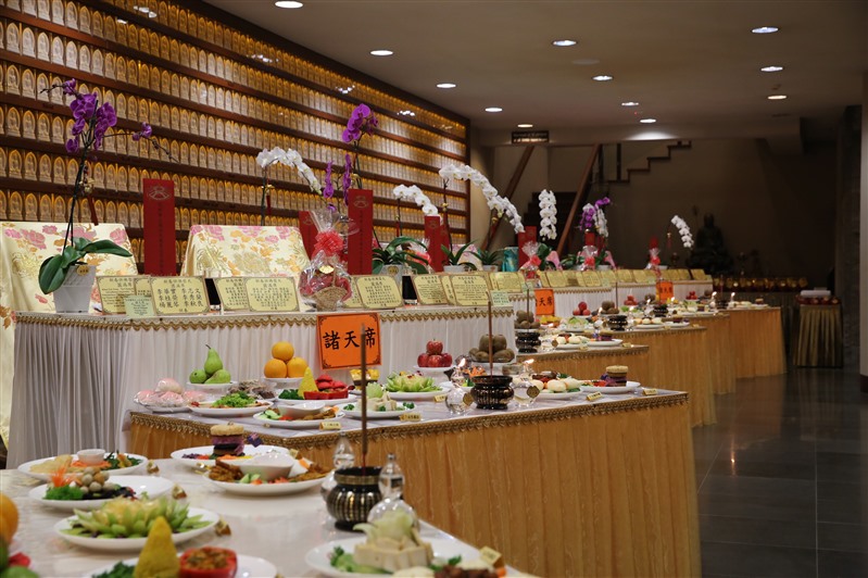 14位紐西蘭佛光青年擔任伺席,引導大眾一一呈上由香積菩薩精心烹調的特色供菜,使供桌上鋪滿色澤鮮艷、造型別緻、香氣誘人的香花燈果和豐盛菜餚,感謝龍天不辭辛勞的常年護佑。