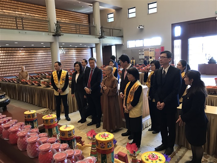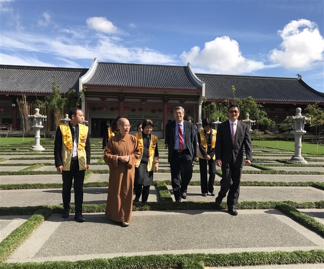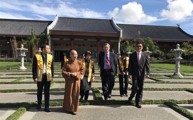 住持滿信法師與介大使相見歡,從文化走廊的各類弘法海報,令介大使特別感恩佛光山在紐西蘭做出的服務與貢獻。在住持帶領下ㄧ行人前往大雄寶殿獻燈,簡介由毛利酋長贈送的綠玉石的起緣;於佛光緣美術館參觀《星雲大師一筆字世界巡迴展》,見到大師ㄧ筆字的墨寶、影片簡介,介大使讚賞大師寫字時的專注,感受大師慈悲力與祥和力,同時章顯ㄧ代偉人的氣象讓人由衷敬佩。