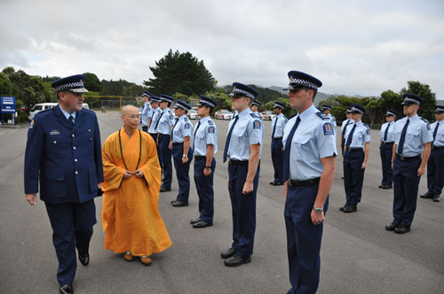 紐西蘭佛光山住持暨紐西蘭皇家警察學院261營隊終身心靈輔導師滿信法師於 2月22日前往威靈頓參加261營隊檢閱典禮。第261 營隊今年2月1日入伍受訓,經過20天緊密的課業學習及體能操練,展現出警察的威武氣質。22日早晨7時,穿著警察制服的261營隊隊員威風凜凜,抬頭挺胸排列整齊地等待檢閱儀式的開始,輔導師滿信法師在警署督導長Superintendent Mike Wilson 的陪同下, 檢閱261營隊41位警員的服裝及威儀。