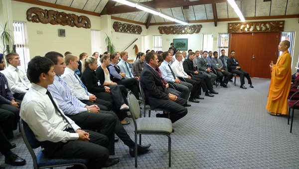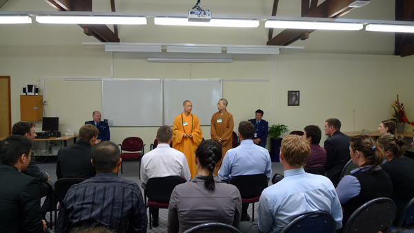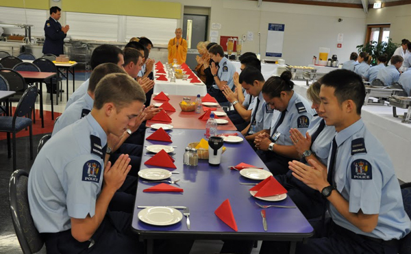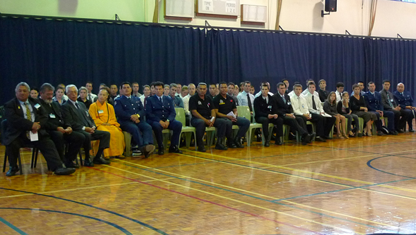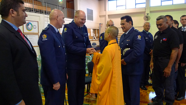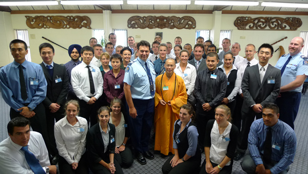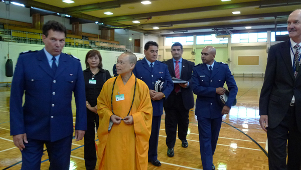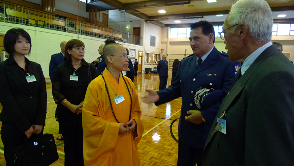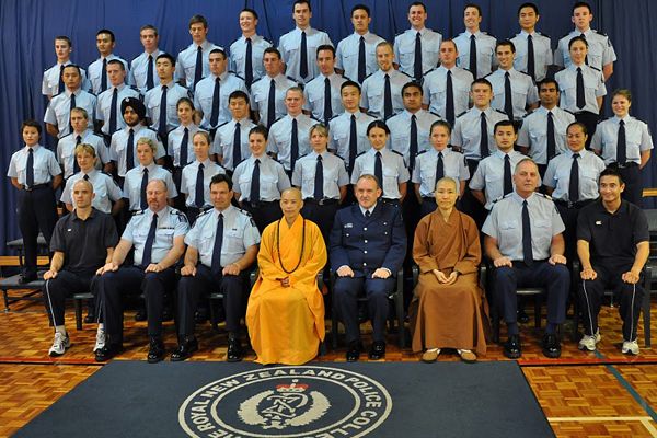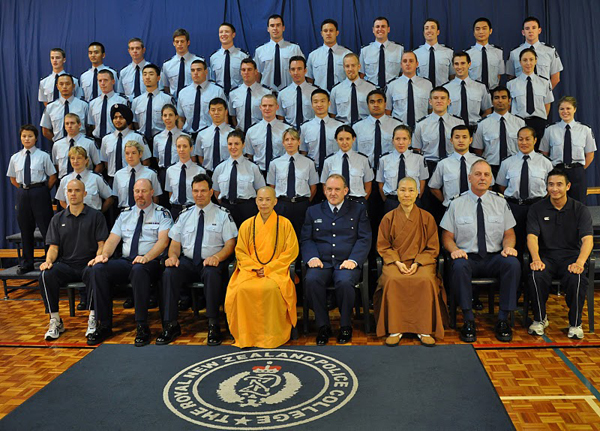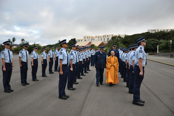紐西蘭佛光山住持暨紐西蘭皇家警察學院261營隊終身心靈輔導師滿信法師於 2月22日前往威靈頓參加261營隊檢閱典禮。第261 營隊今年2月1日入伍受訓,經過20天緊密的課業學習及體能操練,展現出警察的威武氣質。22日早晨7時,穿著警察制服的261營隊隊員威風凜凜,抬頭挺胸排列整齊地等待檢閱儀式的開始,輔導師滿信法師在警署督導長Superintendent Mike Wilson 的陪同下, 檢閱261營隊41位警員的服裝及威儀。
