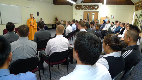 住持滿信法師和261營隊進行會談,讓彼此互相了解。警員們好奇地提問住持的學佛因緣、背景,甚至是袈裟與108顆念珠的意義等。住持和警員分享她在佛學院的生活,鼓勵他們用心學習,像海綿般的吸收知識,畢業後奉獻他們的所學,服務社會;並敘述建設心靈工程的過程, 勉勵大家要勇敢面對問題,用積極正面的態度接受挑戰,豐富自己的人生經驗,希望大家努力耕種心田, 說好話、做好事、存好心, 社會的犯罪率自然會減少。