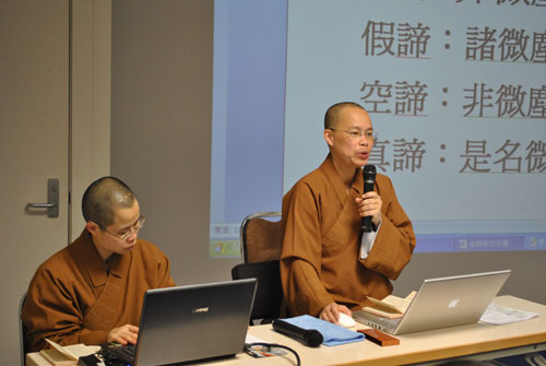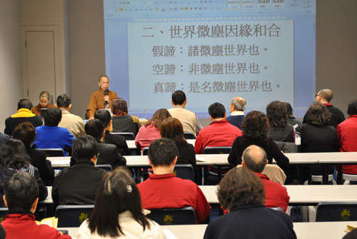 在「如法受持第一義諦分第十三」的內容中,佛陀以身命與受持四句偈等相校量,令大眾開啟般若功德的無限,並且在生活中以一句法語的功德與讚嘆落實此涵意。另外亦從因緣和合的義理中,學習諸佛菩薩「以虛空為座、以法界為床、以菩提為門,以空慧為室」,讓不住諸相,放下執著當中,認識真正的主人翁。同時住持亦從「四相寂滅起大乘行分第十四」,以譬喻講解經義,並如何得四相寂滅,起忍辱大乘行。