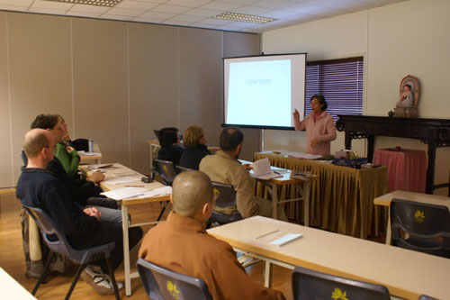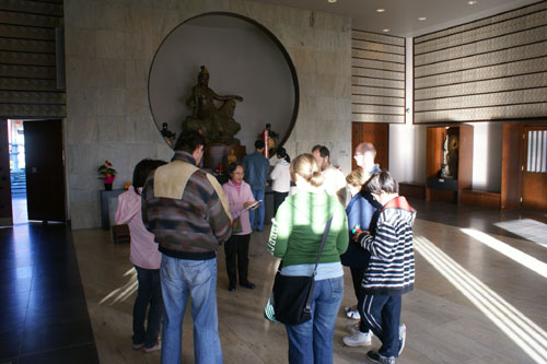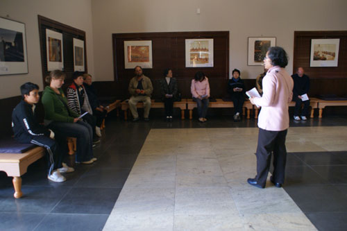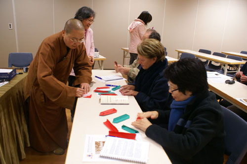 第三梯次北島義工導覽講習會 06 月 21, 2008 因應學校與社會團體來寺參訪日益增加及提昇導覽義工素質,北島佛光山社教組於6月21日下午假香雲堂舉辦「第三梯次北島義工導覽講習會」,由資深導覽義工梁運英師姐協助講解及授課,約15位分會會員及法師與會。課程內容:太極運動練習、禪修帶領方法,以西方社會之所需,要求簡潔厄要,達到最好的效果、佛門一日介紹,讓參予者了解佛教寺院生活特色及弘法理念、摺紙蓮花製做及書法介紹,將中國文化藝術與佛教融合帶入西方社會,推動多元文化色彩。