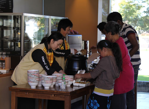 24日一早「紐西蘭佛光人賑災服務中心」啟動服務機制,在開放熱食服務的第一天馬上有將近200位的居民前來飲食,有植物園的公務員、無家可歸的災民、有市政府急難救援中心的公務員,他們大多數是友人的轉告及門口的告示牌的指引,並表示將會讓更多人得知此消息,同時很感謝佛光人的用心服務,他們說這裡食物是這三天以來最好吃的食物。