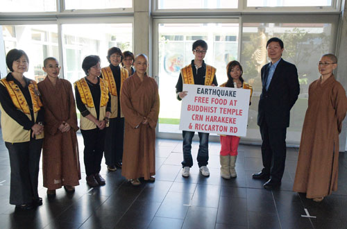 紐西蘭佛光山住持滿信法師於2月23日晚間從奧克蘭飛抵基督城,隨即於基督城的南島佛光山召開地震賑災會議,並當下成立「紐西蘭佛光人賑災服務中心」。住持滿信法師指示「紐西蘭佛光人賑災服務中心」有如下項目:1.每日上午10時至下午6時免費提供熱食。2.免費提供簡易醫療藥品及清潔用品。3.免費提供網路上線服務。4.開放殿堂讓民眾禮佛淨心。5.為災民籌募重建基金。6.為災民消災為罹難者者超薦。相關訊息立即透過紐西蘭國家電台傳播給大眾。