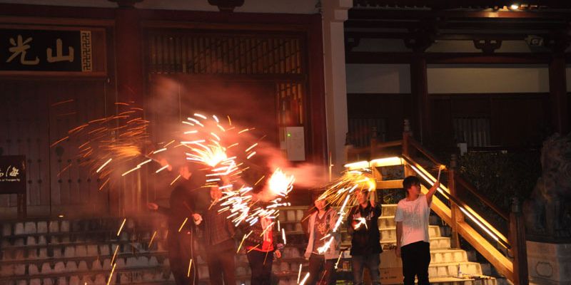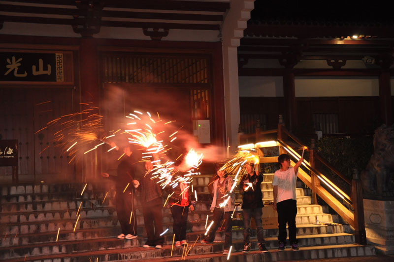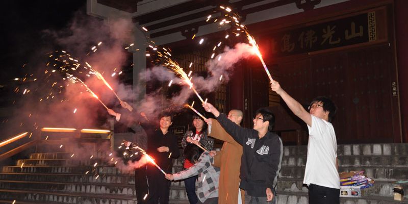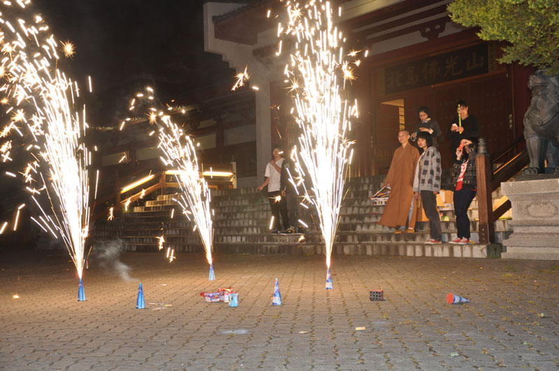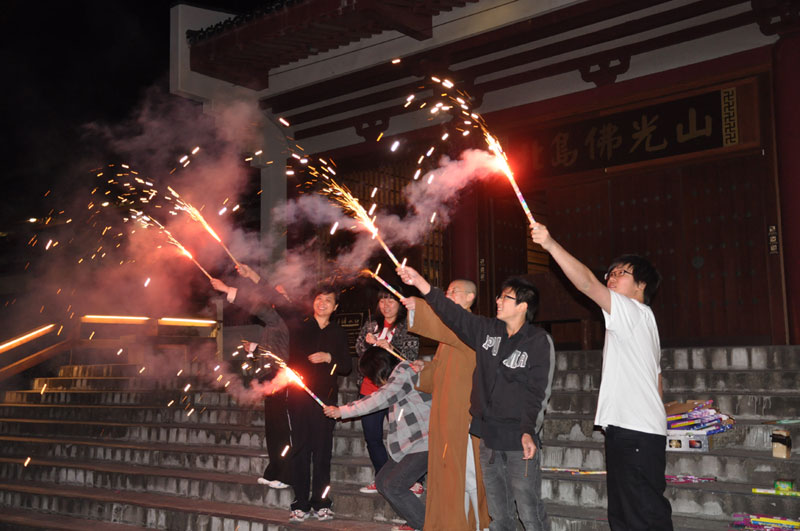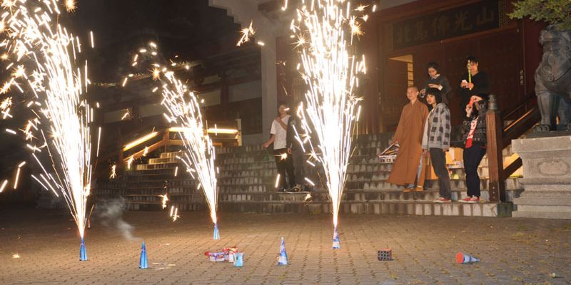 紐西蘭北島佛光山十位義工師姐及北島佛光青年分團的青年們,亦趁此節慶,在大悲殿前廣場上釋放煙火,籍此讓忙於苦讀、預備期未大考的心情得到舒放。膽子較大的一手拿著「冲天炮」,神采奕奕的點燃釋放,膽子較小也不甘示弱,點燃著「仙女棒」自娛一番,大家各取所好,盡興而玩。