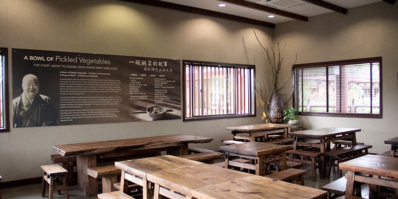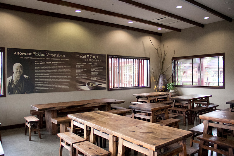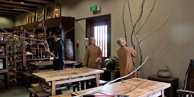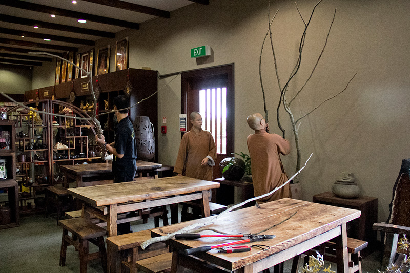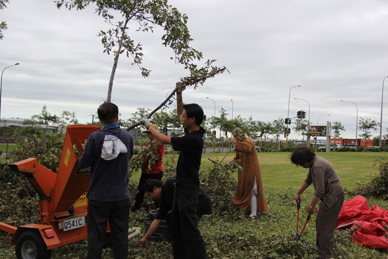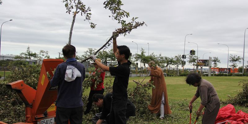 秉持著國際佛光會2010世界會員代表大會主題~環保與心保理念,紐西蘭北島佛光山於近月為園林修剪樹木後,不但將部份具藝術形態、粗莊、美觀等枝幹留下外,並將其餘之樹枝與葉子磨碎,成為樹皮,補在大樹底下,免於雜草叢生。3月21日上午在住持滿信法師的指導下,園藝組於早齋後,將這些具藝術形態的粗枝修剪,並擺設在滴水坊及道場各角落以發揮其功能。從集體創作中,讓大眾在享用素食餐點之際,亦展現文化與藝術的環保生活。