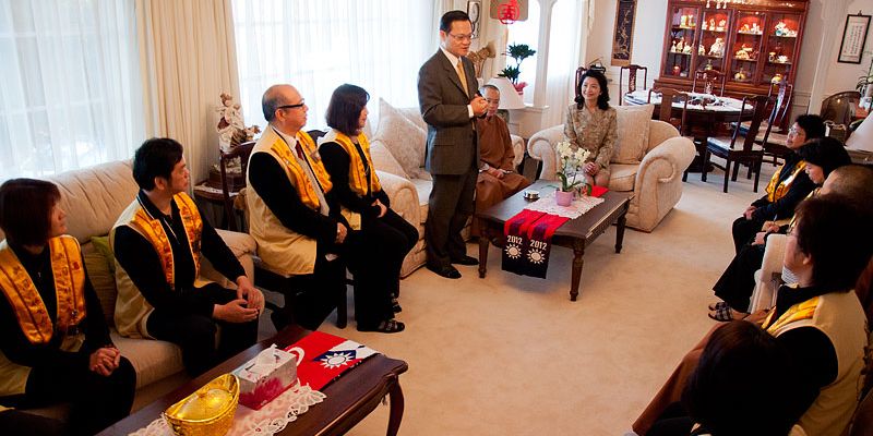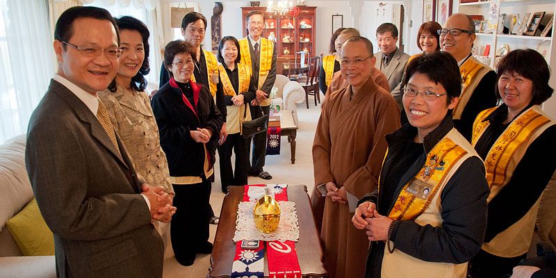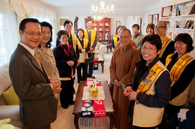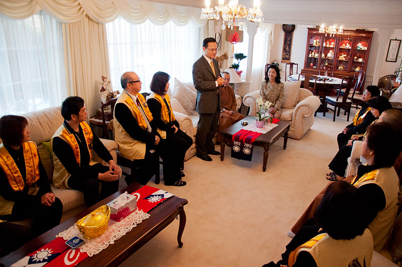丁處長樂群首先致詞歡迎住持及全體佛光人的光臨,讓他的家有如篷壁生輝,真是大喜之日。處長表示北島佛光山是他到任後拜訪最多次的地方,因為佛光山的門永遠是開的。親近佛法令他改變了許多人生觀,與滿信法師及佛光人的接觸也使他感受到更多的能量與歡喜,希望與大家繼續努力共勉。住持也代表全體佛光人感謝丁處長伉儷的邀請,讚嘆丁處長是一位可親、親民的外交官,精進的照顧僑民十分難能可貴,佛光人也很榮幸首度應邀至官邸做客。