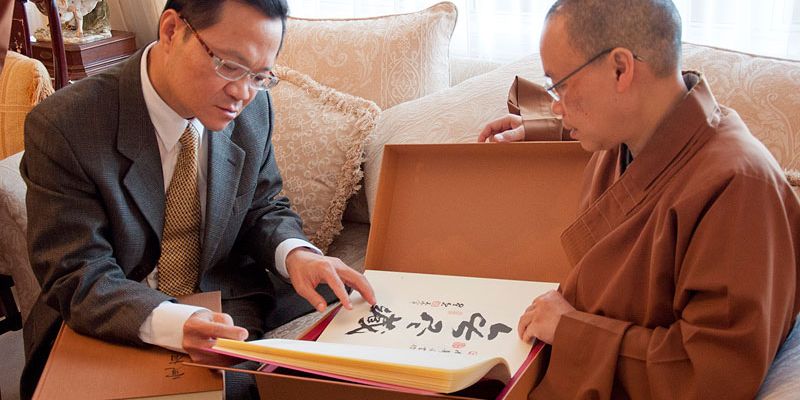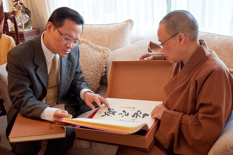 在融合愉快的交流中,住持滿信法師代表贈送星雲大師墨寶精選集『覺有情』,以及台灣佛陀紀念館開幕典禮DVD專集結緣。大家在圓滿歡喜的氛圍中共渡一個別有特色下午。