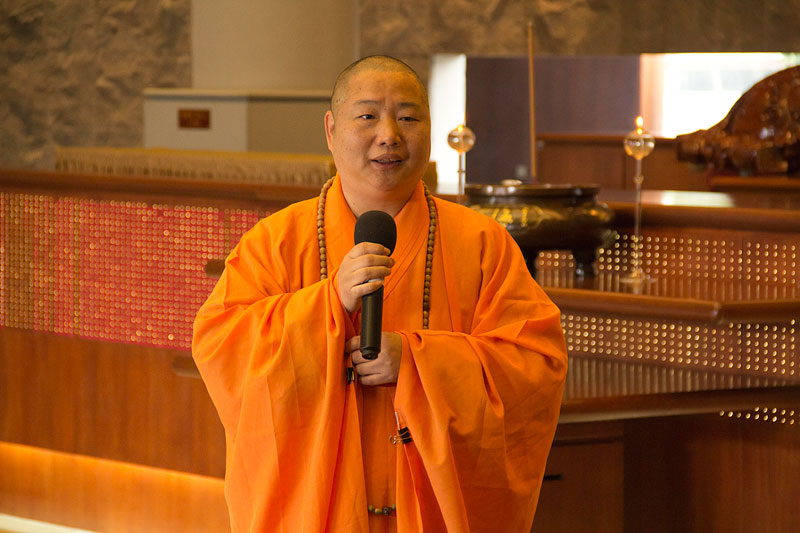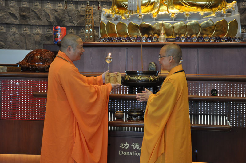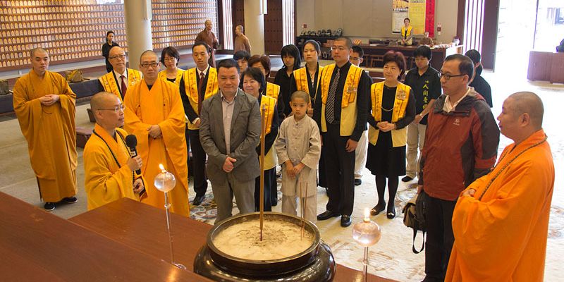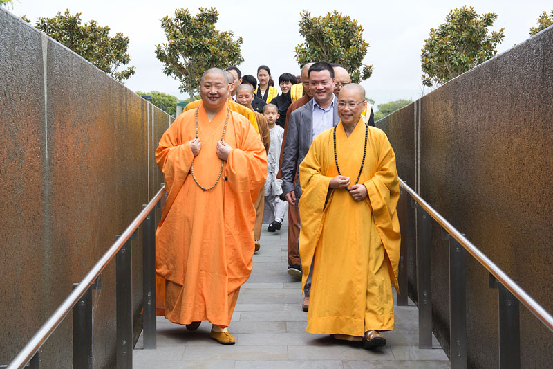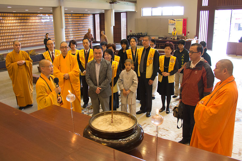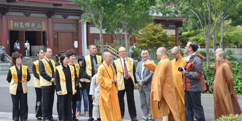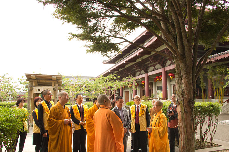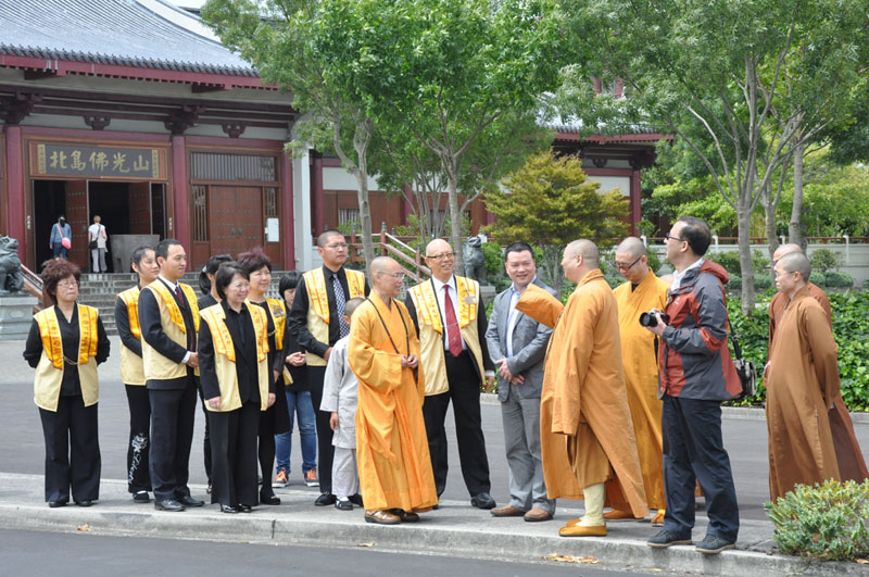 住持引領至大雄寶殿禮佛,簡介紐西蘭南北島佛光山道場秉持星雲大師人間佛教「以文化弘揚佛法、以教育培養人才」等理念在海外的弘揚。隨即導覽大雄寶殿的玉佛、光纖的光明燈、簡樸莊嚴的六供養菩薩與石彫佛像等,從簡潔、清新的建設以回歸大自然、回到佛陀的本懷,希望大眾前來禮佛時,以專注一心,轉化自己的喜怒憂愁等,在沒有語言的干擾下,回到自己的根部思維。
