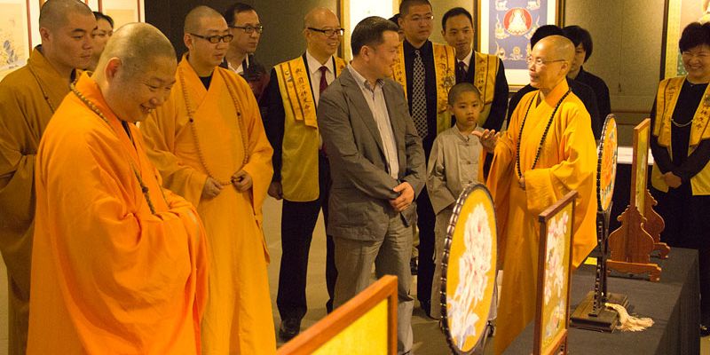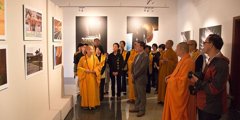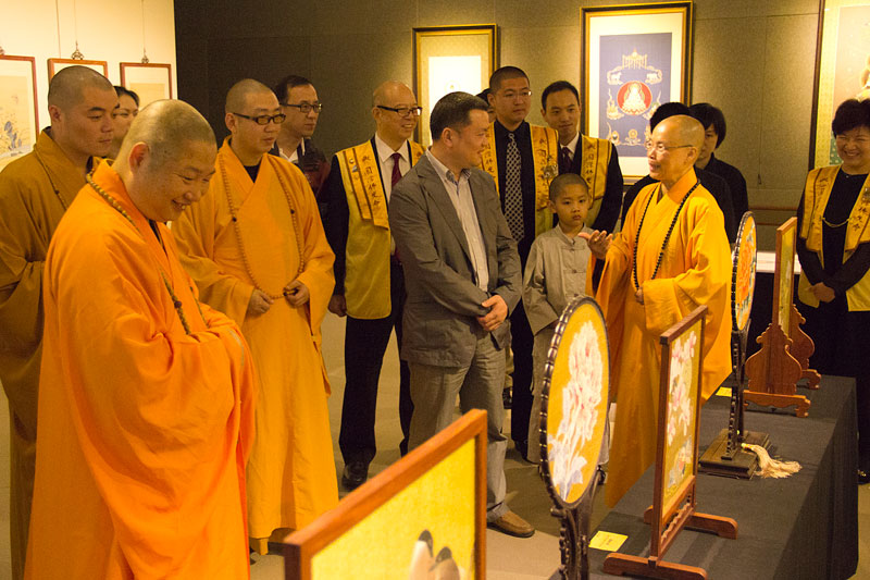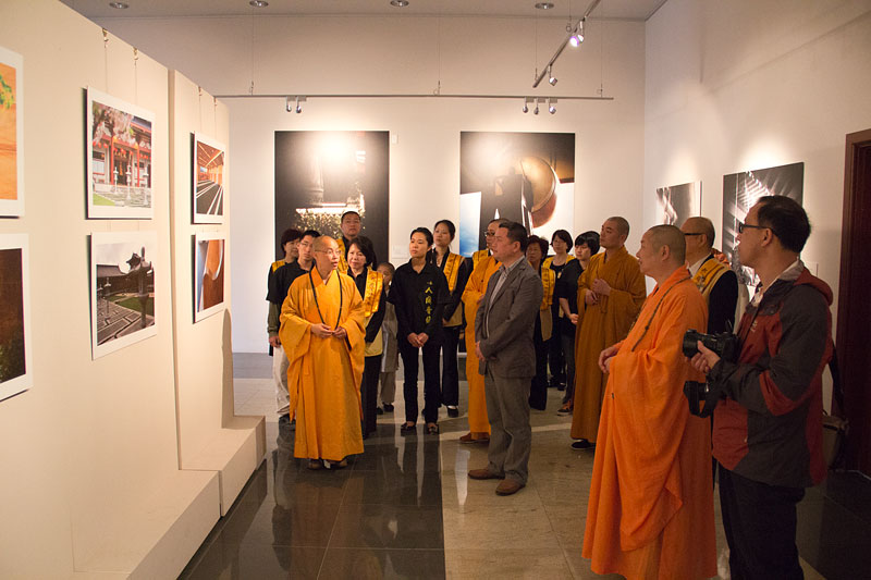 住持滿信法師接著引領允觀法師等貴賓參觀正在佛光緣美術館紐西蘭1館展出的陳文緙絲藝術展,大家對緙絲藝術精巧細膩、栩栩如生的作品相當讚嘆;對於「人間攝影展」將影像藝術作為教學材料的創意也十分欣賞。住持也介紹道場園藝的設計概念,本著尊重紐西蘭文化及融合多元文化的精神,以時間和耐心將本地原生千年樹木Totara Tree成功的植入寺院丹墀中,讓自然景觀更加圓滿豐富。